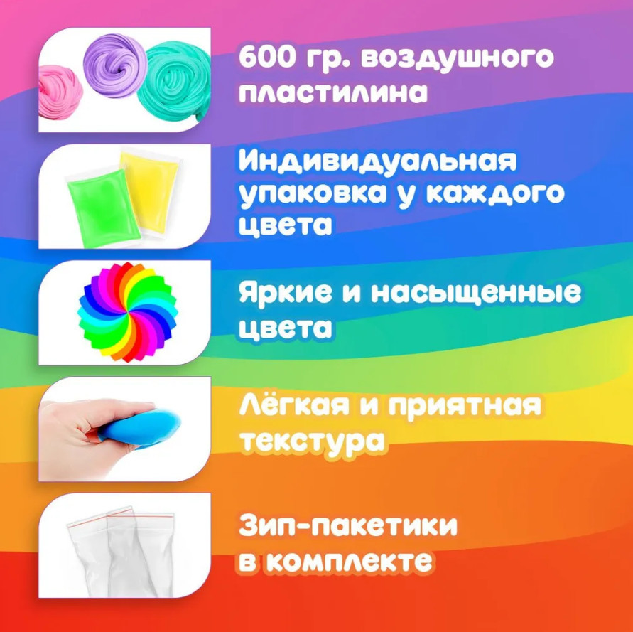 Набор легкого воздушного пластилина, который содержит удобные для моделирования глиняные массы. Этот детский пластилин не только идеально подходит для креативных и развивающих игр, но и станет прекрасным инструментом для творчества и моделирования. Создавайте потрясающие фигуры, развивайте свои навыки и фантазию с этим уникальным набором. Воздушный пластилин создан специально для маленьких пальчиков и легко поддается лепке. После высыхания он полностью застывает и сохраняет форму, не оставляя следов на одежде, руках и мебели, что очень важно для удобства в творческом процессе. Легкий пластилин — это не только игра, но и способ развивать мелкую моторику рук, координацию и фантазию ребенка. Такое творческое времяпрепровождение будет радовать как детей, так и взрослых! Набор воздушного пластилина станет прекрасным подарком на любое торжество. |