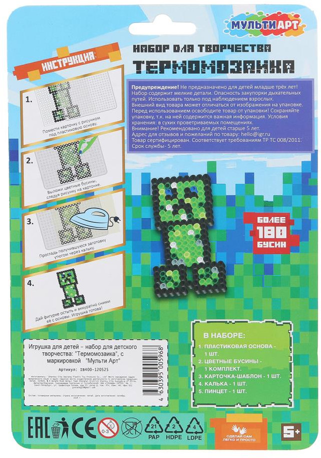 💳 Оплатить за товар можно при получении 🇰🇿 Есть бесплатная доставка по Казахстану 🎁 Копите бонусы с каждой покупки Набор для детского творчества — термомозаика «Мир пикселей» ТМ «Мульти Арт» — отличный подарок для ребёнка. Из разноцветных бусин, входящих в данный набор, юный мастер сможет собрать фигурку героя из известной видеоигры. Чтобы зафиксировать рисунок, бусины нужно накрыть специальной пергаментной бумагой и прогладить нагретым утюгом. Получившуюся фигурку можно будет использовать для дальнейшей игры. Творческие занятия с термомозаикой ТМ «Мульти Арт» развивают: фантазию и воображение, мелкую моторику, креативное мышление, внимание и усидчивость. |