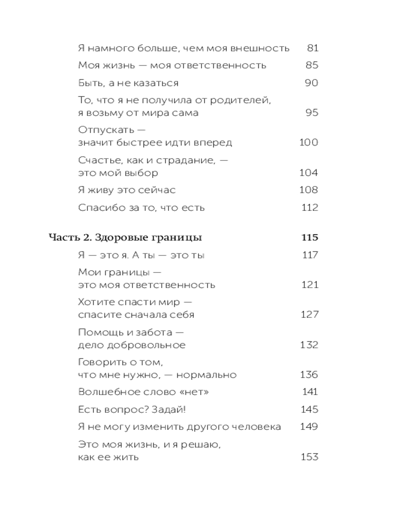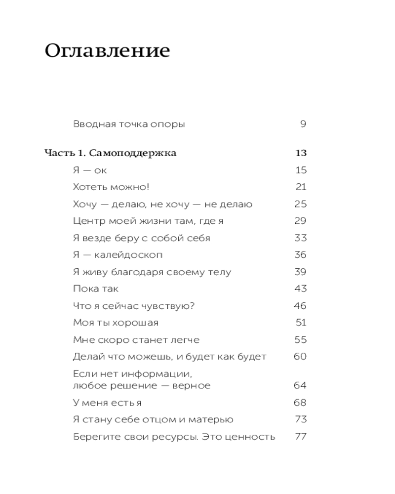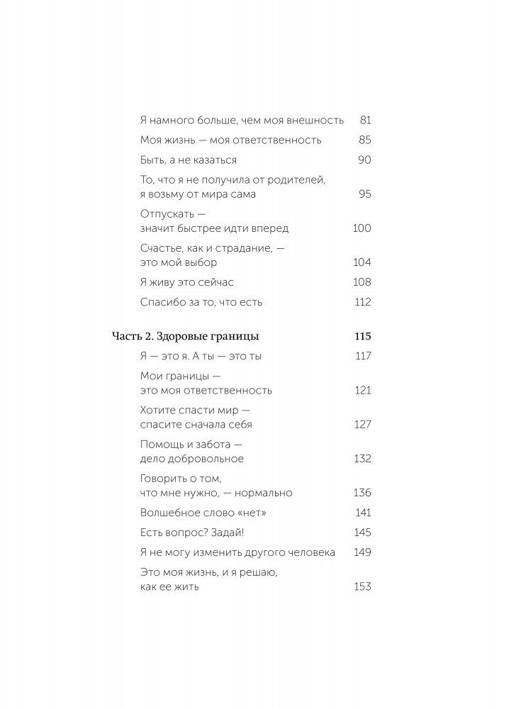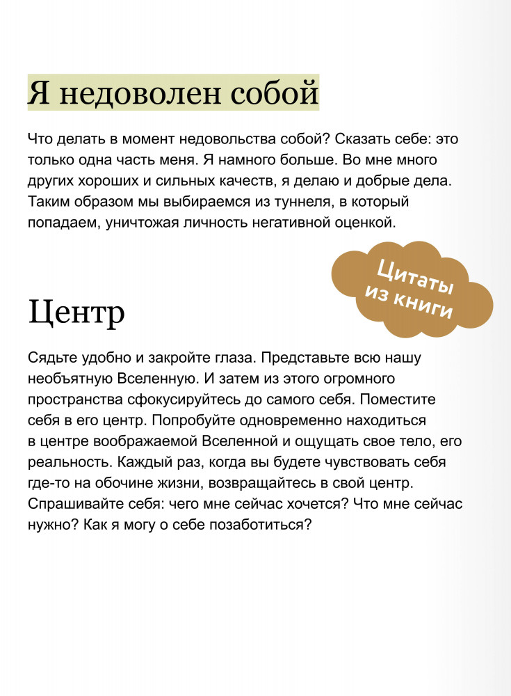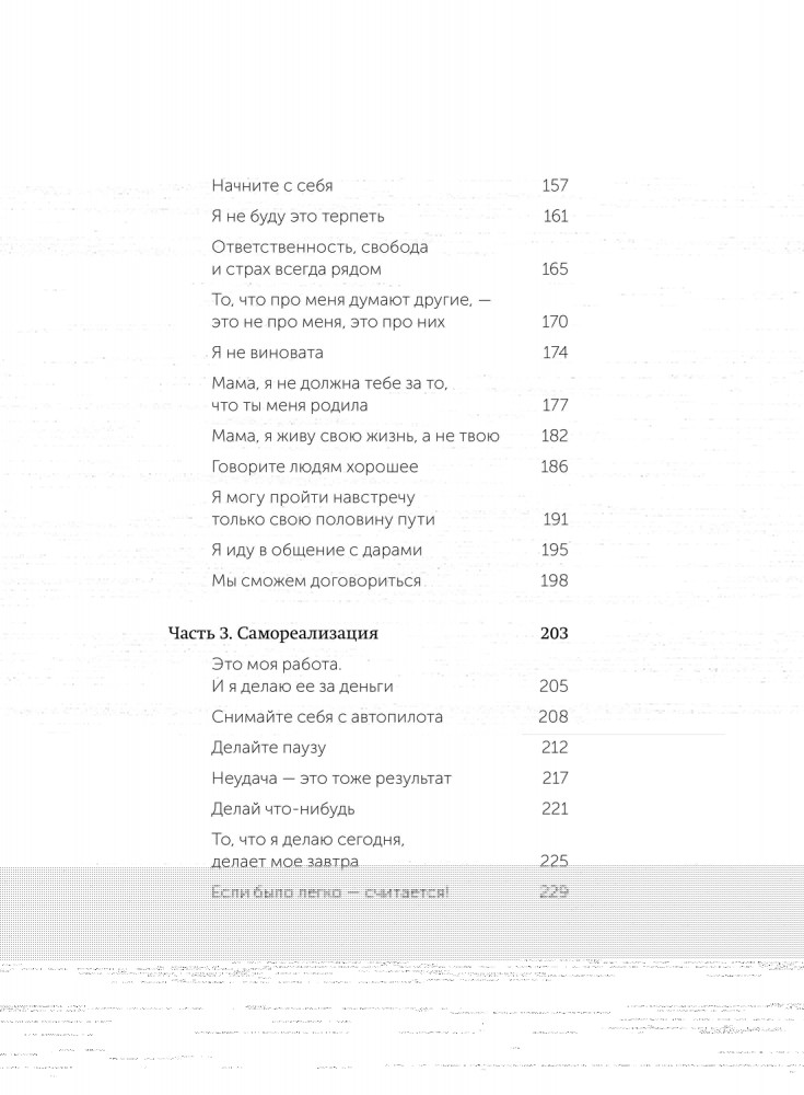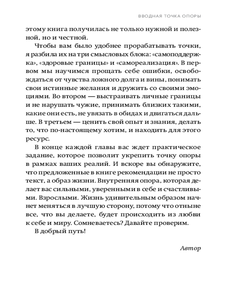 Каждая глава в книге — разбор конкретной установки с примерами и подробным алгоритмом, который поможет сформировать эту опору внутри себя. Вы сможете кирпичик за кирпичиком выстроить фундамент позитивных изменений и стать той личностью, какой хотите быть. |