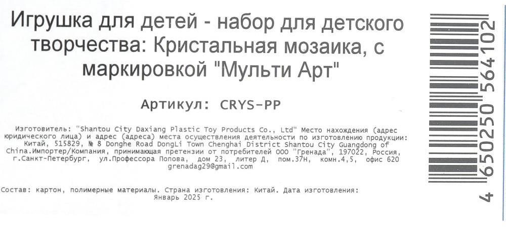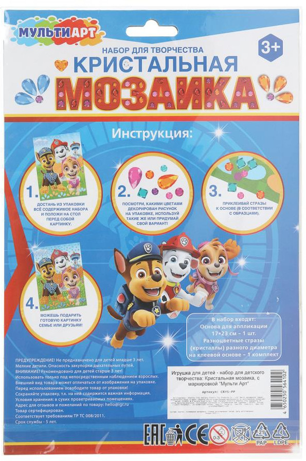💳 Оплатить за товар можно при получении 🇰🇿 Есть бесплатная доставка по Казахстану 🎁 Копите бонусы с каждой покупки Серия: Суперщенки Набор для творчества — кристальная мозаика «Суперщенки» ТМ «Мульти Арт» — отличный подарок для ребёнка, который будет способствовать развитию его творческих способностей. При помощи этого набора маленький художник сможет создать блестящую картину с изображением отряда щенков-спасателей, декорированную сверкающими стразами разных форм и размеров. Готовая поделка станет отличным вариантом для подарка близким или для украшения интерьера детской комнаты. Творческие занятия с кристальной мозаикой ТМ «Мульти Арт» обладают успокаивающим действием, а также развивают: творческое мышление, цветовое восприятие, усидчивость, внимание и аккуратность. |