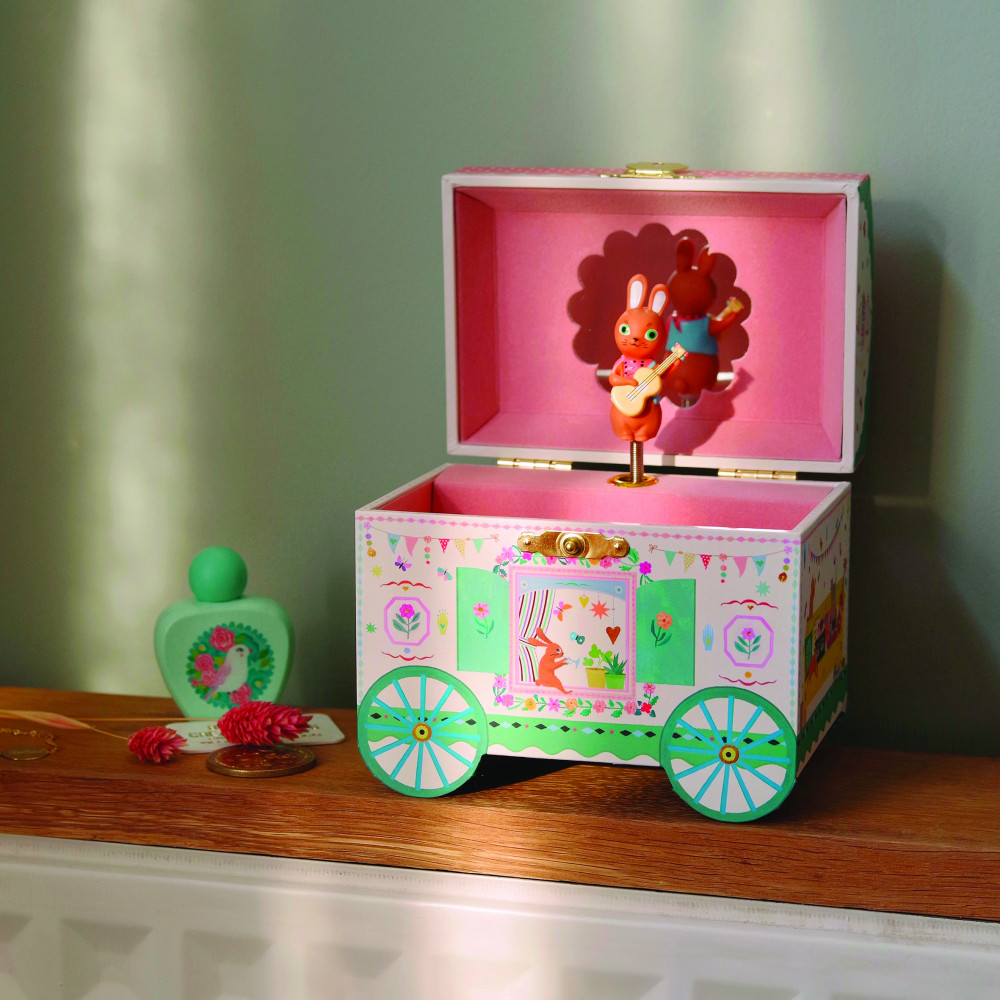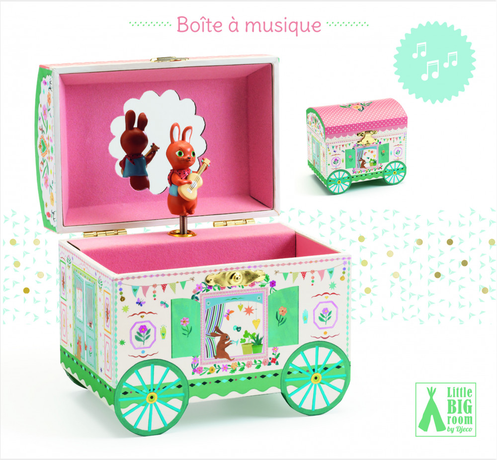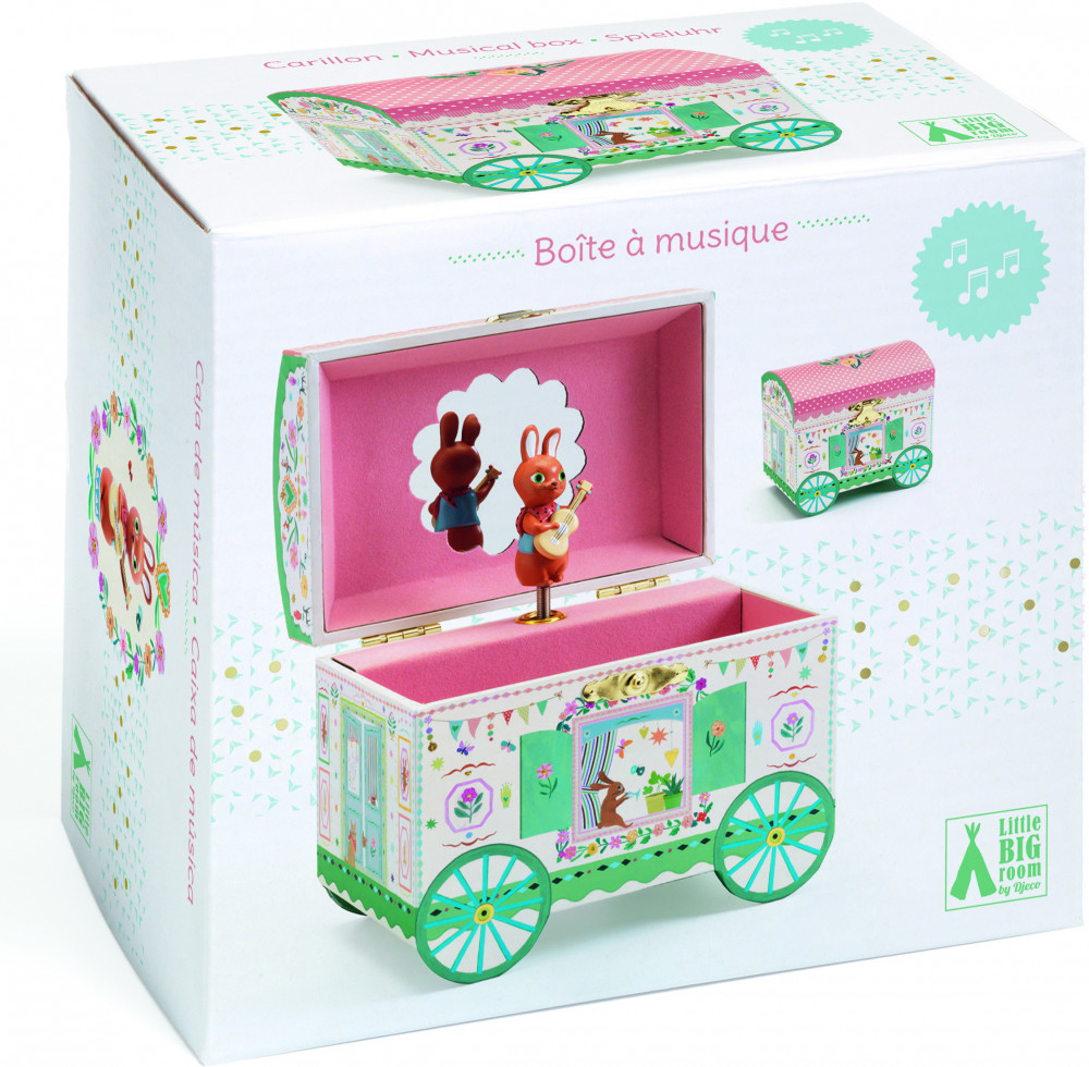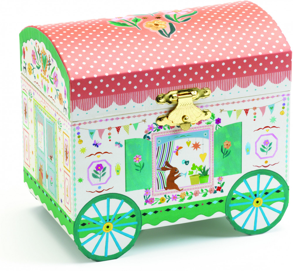 Djeco Музыкальная шкатулка «Караван»В данный момент этот товар отсутствует в продаже. Возможно, у нас найдется аналогичный или похожий товар здесь. Roulotte enchantée — это красивая музыкальная шкатулка в форме фургона, в которой можно хранить драгоценности и другие секретные вещи. Поверните ручку и откройте шкатулку, вас ждет сюрприз! Изящно вырезанный кролик, отражаясь в фигурном зеркале, превращается в «Время вишен» Антуана Ронсона. |