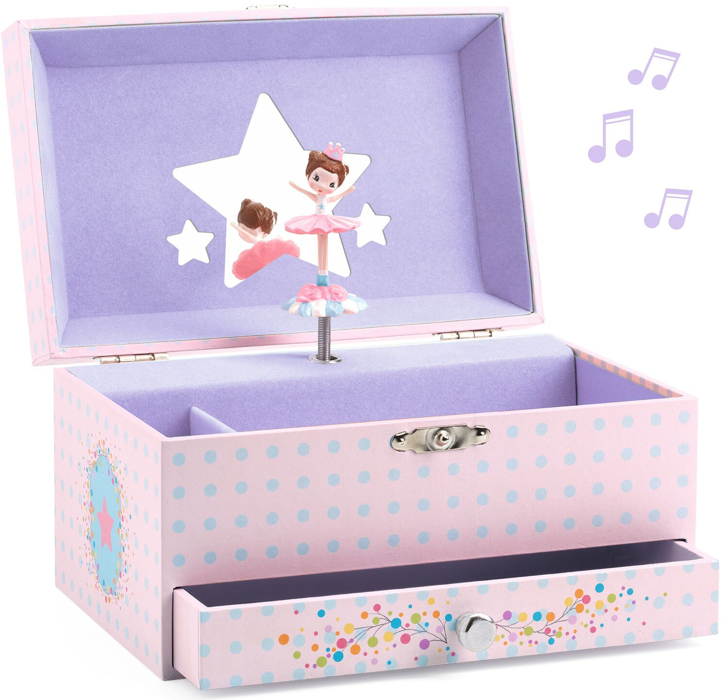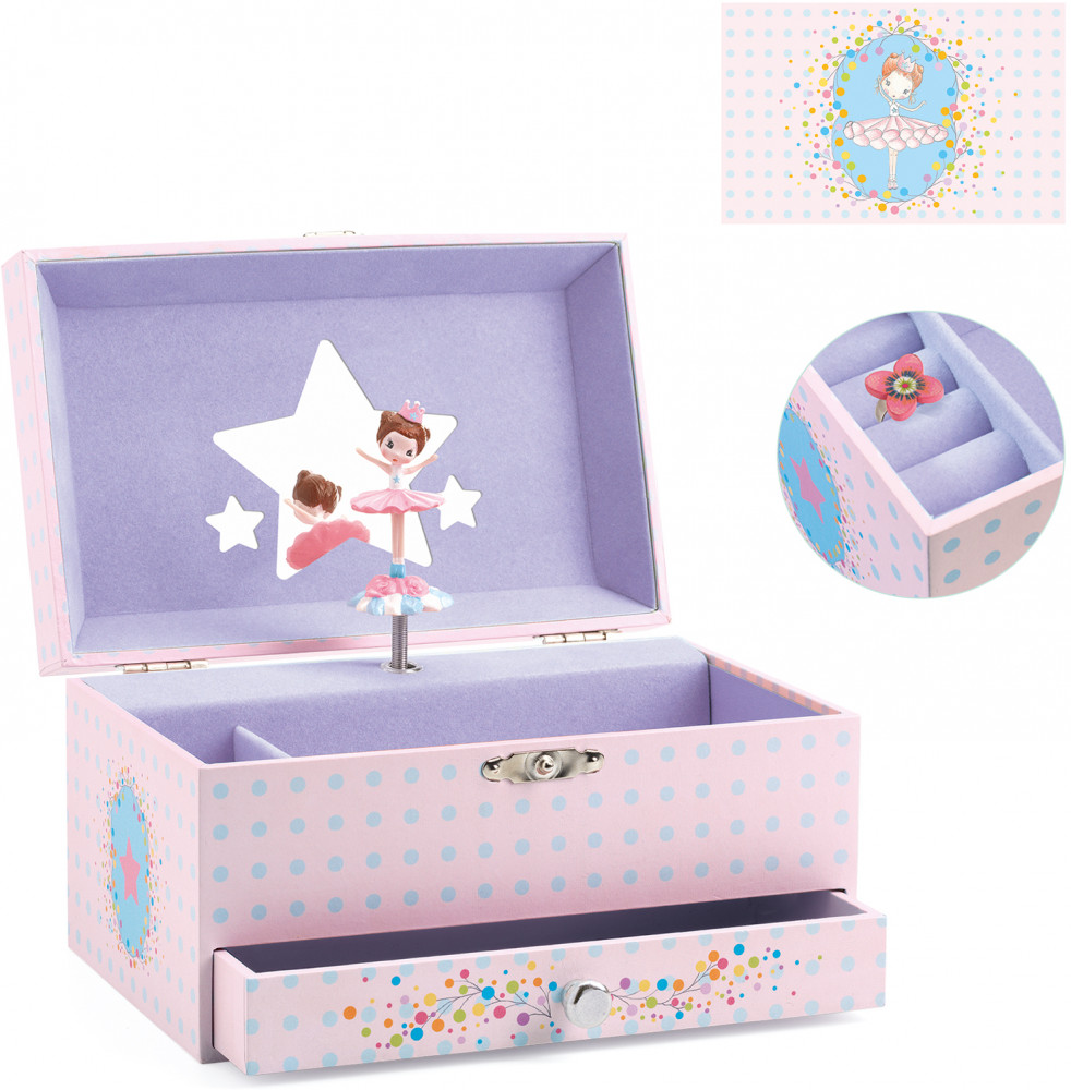 Djeco Музыкальная шкатулка «Мелодия балерины»В данный момент этот товар отсутствует в продаже. Возможно, у нас найдется аналогичный или похожий товар здесь. Откройте эту прекрасную музыкальную шкатулку от Djeco и вы обнаружите в ней удивительную балерину, вращающуюся под звучание чудесной мелодии «Приглашение на танец» Карла Марии фон Вебера. На крышке шкатулки, за изящной балериной, находится зеркало в форме звезды, добавляющее ей особой изысканности. Внутри шкатулки имеется отдельный ящик для хранения украшений маленькой принцессы. Вся внешняя поверхность шкатулки оформлена прекрасной розово-цветочной бумагой, придающей ей особый шарм. |