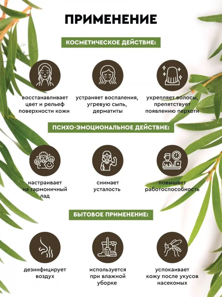 Эфирное масло получают из листьев малалеуки, растения, произрастающего в Австралии. Холодный тонизирующий аромат отличает древесная пряная база с терпкими и горьковатыми оттенками. Масло чайного дерева — непревзойденный дерматологический антисептик. Обеззараживает воздух. Повышает работоспособность.