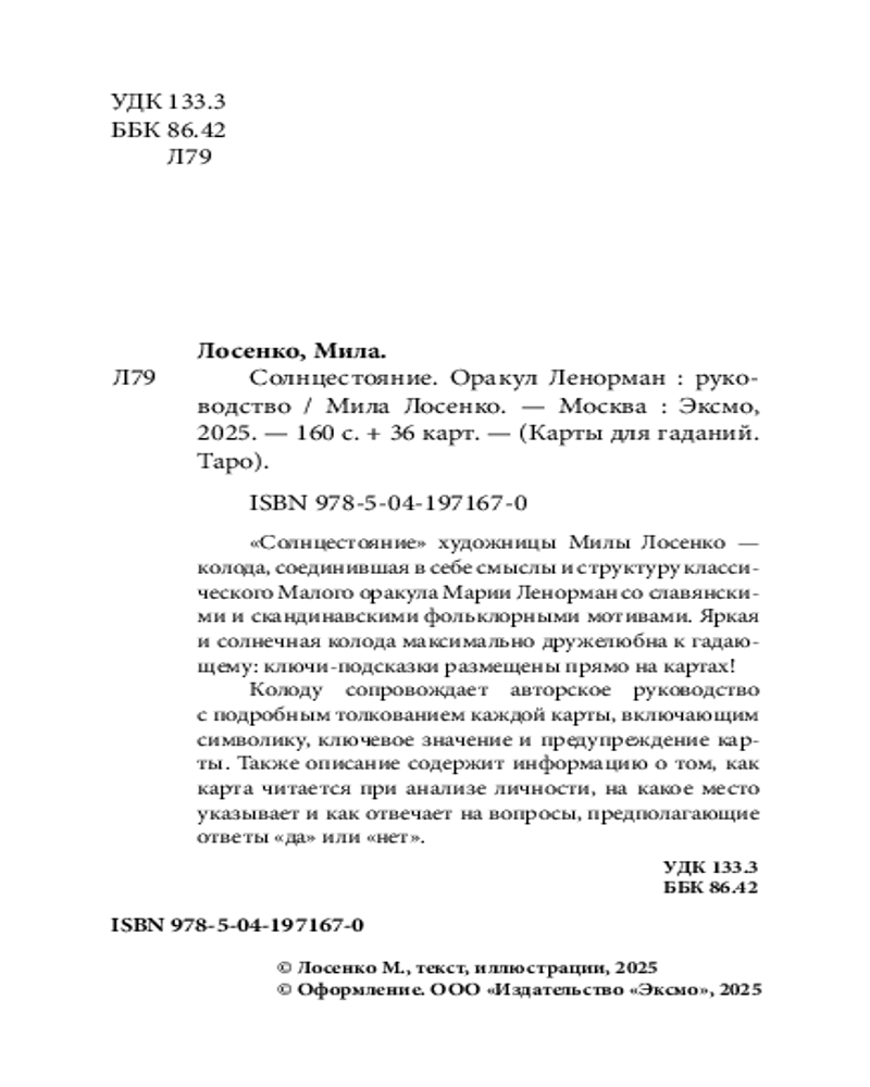 💳 Оплатить за товар можно при получении 🇰🇿 Есть бесплатная доставка по Казахстану от 1 дня 🎁 Копите бонусы с каждой покупки Серия: Карты для гаданий. Таро «Солнцестояние» художницы Милы Лосенко — колода, соединившая в себе смыслы и структуру классического Малого оракула Марии Ленорман со славянскими и скандинавскими фольклорными мотивами. Яркая и солнечная колода максимально дружелюбна к гадающему: ключи-подсказки размещены прямо на картах! |