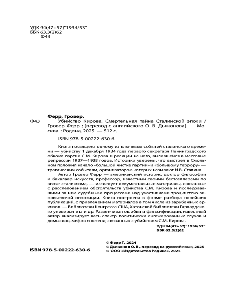 💳 Оплатить за товар можно при получении 🇰🇿 Есть бесплатная доставка по Казахстану от 1 дня 🎁 Копите бонусы с каждой покупки Серия: Смертельная тайна Книга посвящена одному из ключевых событий сталинского времени — убийству 1 декабря 1934 года первого секретаря Ленинградского обкома партии С.М. Кирова и реакции на него, вылившейся в массовые репрессии 1937–1938 годов. Историки уверены, что выстрел в Смольном положил начало «большой чистке партии» и «большому террору» — трагическим событиям, организатором которых называют И.В. Сталина. Автор Гровер Ферр, американский историк, доктор философии и бакалавр искусств, профессор, известный своими бестселлерами по эпохе сталинизма, исследует документальные материалы, связанные с расследованием обстоятельств убийства С.М. Кирова и последовавшими за ним судебными процессами над участниками троцкистско-зиновьевской оппозиции. |
