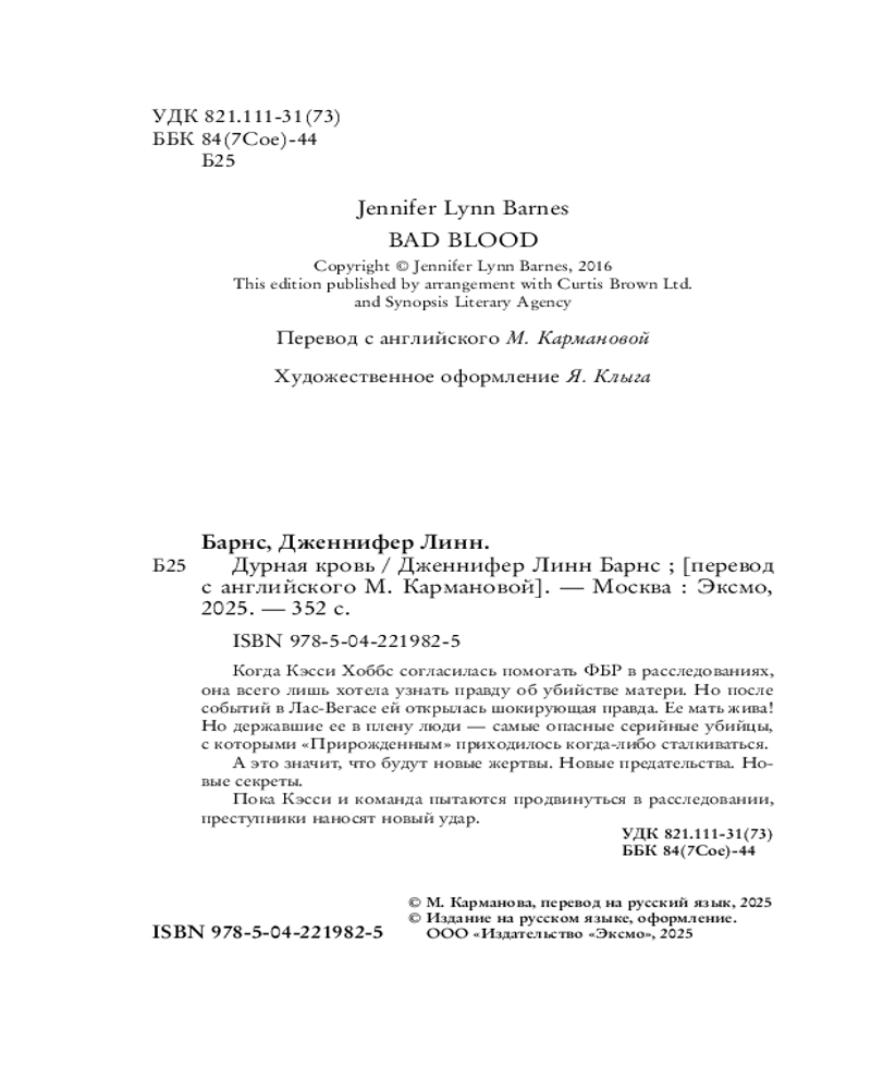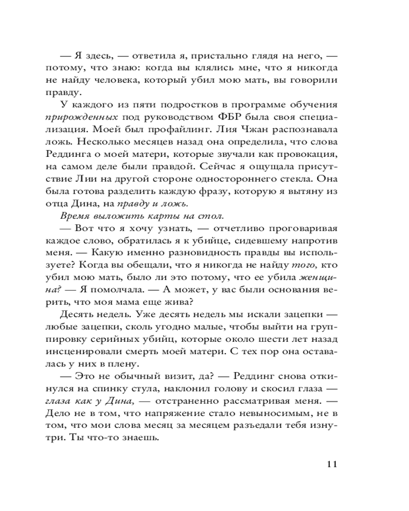 💳 Оплатить за товар можно при получении 🇰🇿 Есть бесплатная доставка по Казахстану от 1 дня 🎁 Копите бонусы с каждой покупки Серия: Young Adult. Разгадай меня, если сможешь «Прирожденные» — захватывающий психологический триллер, в котором молодые и талантливые парни и девушки используют свои способности и помогают ФБР раскрывать самые запутанные преступления. Когда Кэсси Хоббс согласилась помогать ФБР в расследованиях, она всего лишь хотела узнать правду об убийстве матери. Но после событий в Лас-Вегасе ей открылась шокирующая правда. Ее мать жива! Но державшие ее в плену люди — самые опасные серийные убийцы, с которыми «Прирожденным» приходилось когда-либо сталкиваться. А это значит, что будут новые жертвы. Новые предательства. Новые секреты. Пока Кэсси и команда пытаются продвинуться в расследовании, преступники наносят новый удар. |