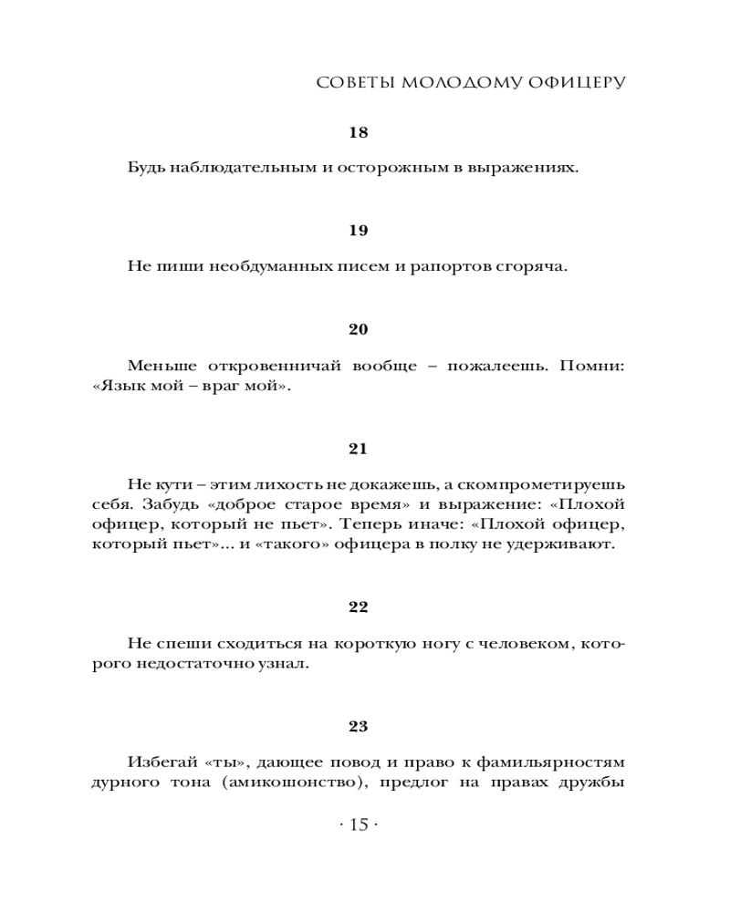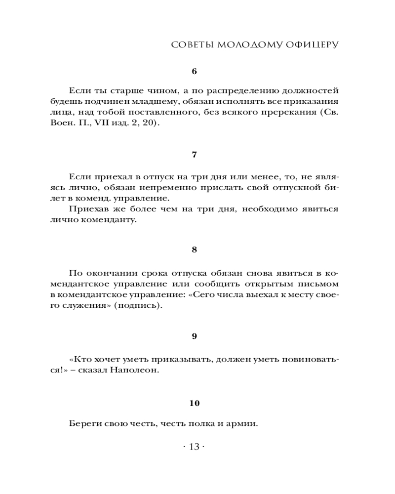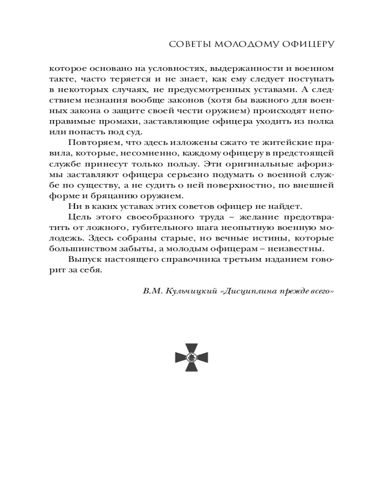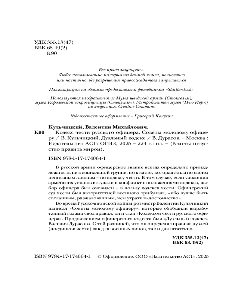 💳 Оплатить за товар можно при получении 🇰🇿 Есть бесплатная доставка по Казахстану 🎁 Копите бонусы с каждой покупки Серия: Власть: искусство править миром В русской армии офицерское звание всегда определяло принадлежность не к социальной группе, но к касте, которая жила по своим неписаным законам — по кодексу чести. В том случае, если уложения армейских уставов вступали в конфликт с положениями кодекса, выбор офицера был очевиден — в пользу кодекса чести. Офицерский суд чести был авторитетней военного трибунала, «ибо лучше быть сосланным, разжалованным, чем утратить достоинство». Во время Русско-японской войны ротмистр Валентин Кульчицкий написал «Советы молодому офицеру», которые обобщили выработанный годами свод правил, он и стал «Кодексом чести русского офицера». Продолжением офицерского кодекса был «Дуэльный кодекс» Василия Дурасова. С той разницей, что он определял правила дуэлей (поединков чести) как для военных чинов, так и для штатских. |