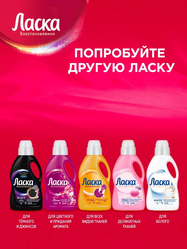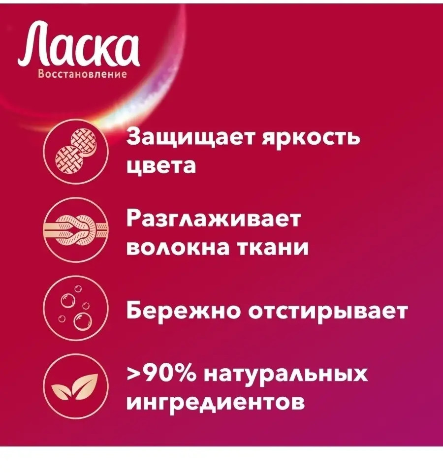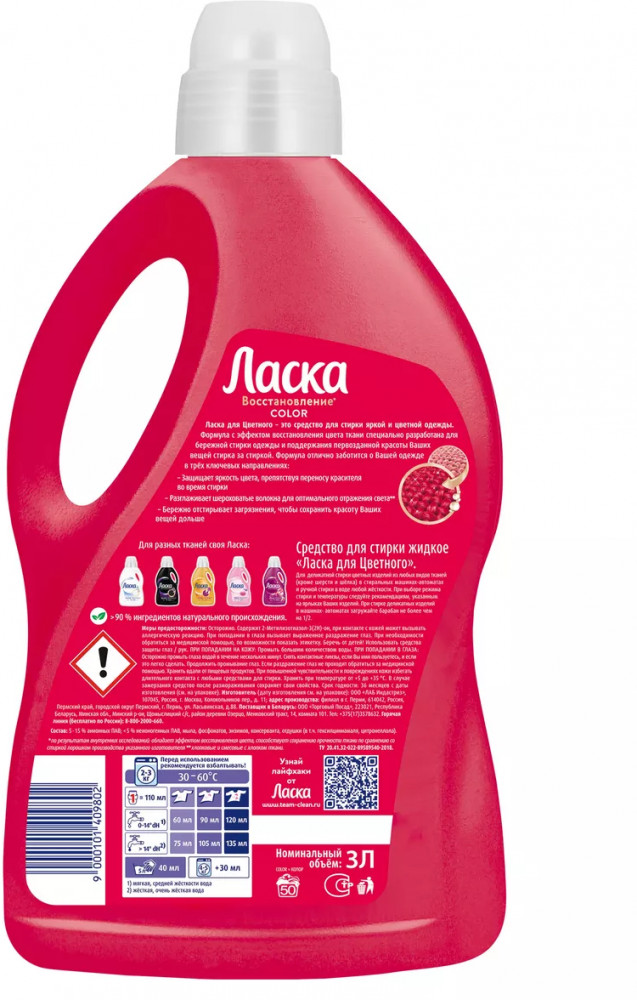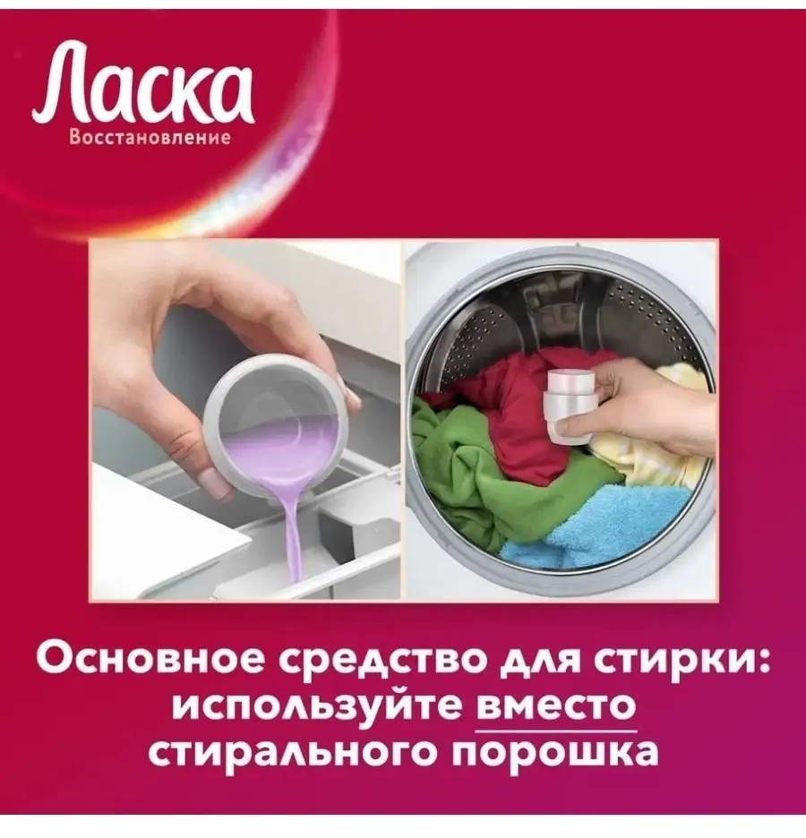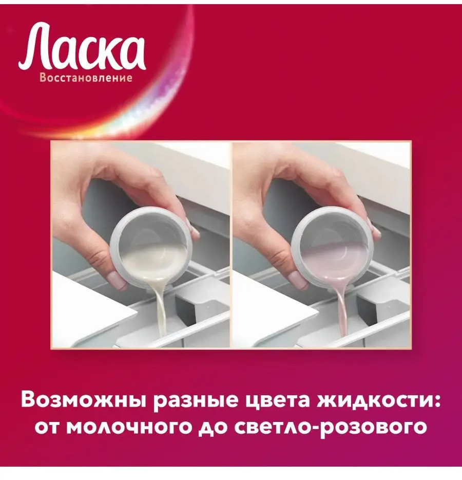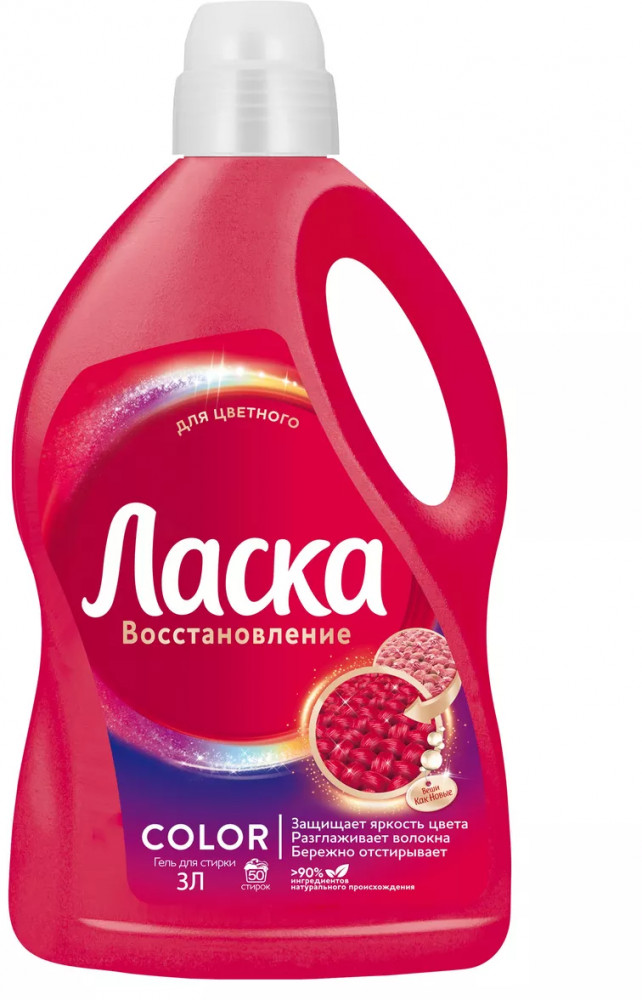 Гель для стирки Ласка Восстановление Color для цветного белья эффективно и бережно отстирывает загрязнения на одежде, восстанавливая яркость цвета и сохраняя прочность волокон ткани. В отличие от обычного стирального порошка, Ласка содержит цветозащитные ингредиенты, которые поддерживают стойкость цвета одежды. Активные компоненты способствуют уменьшению количества катышков на ткани. Формула содержит более 90% ингредиентов натурального происхождения.