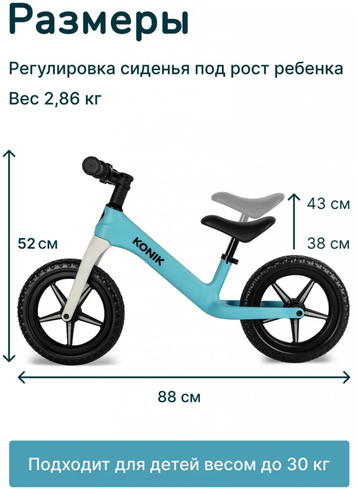 Беговелы Konik Go! — первые шаги к приключениям! Знакомьтесь: беговел Konik Go! для детей от 2 до 5 лет. Беспедальный велосипед подойдёт для ребёнка ростом 86-110 см и весом до 30 кг. Беговел для малыша — это идеальный подарок для мальчиков или девочек, которые по возрасту ещё не готовы пересесть на велосипед. Благодаря беговелу переход на полноценный велосипед оказывается максимально быстрым и безболезненным.