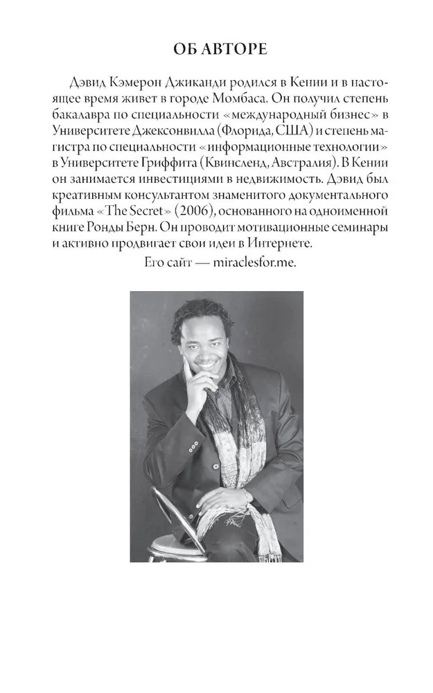 | Дэвид Кэмерон Джиканди — предприниматель, коуч и мотивационный спикер. Был приглашен в качестве креативного консультанта для создания фильма-события 2006 г. «The Secret», основанного на одноименной книге Ронды Берн. Он автор нескольких книг, включая книгу по саморазвитию — «Счастливый карман, полный денег» — предлагающую уникальный пошаговую технику привлечения богатства, изобилия и счастья. Любимая тема Дэвида Кэмерона Джиканди — раскрытие внутренней силы человека, его богатого потенциала и... |