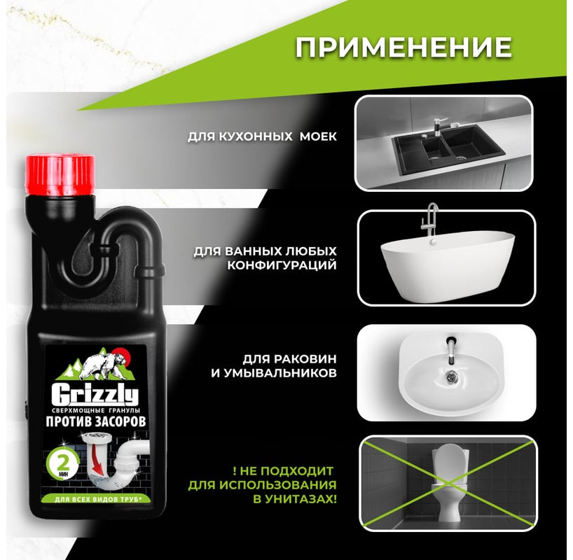 💳 Оплатить за товар можно при получении 🇰🇿 Есть бесплатная доставка по Казахстану 🎁 Копите бонусы с каждой покупки Серия: Grizzly Grizzly — гранулированное средство для устранения сложных засоров. За 2 минуты удаляет сложные засоры из волос, остатков пищи, жира, полиэтилена, бумаги и подгузников. Безопасен для всех видов труб. Особенностью Unicum Grizzly является его сверхмощный состав. Гранулы содержат активные компоненты, которые быстро и эффективно растворяют засоры, обеспечивая чистоту и свежесть в доме. |