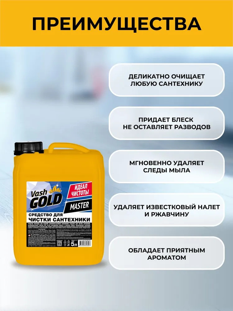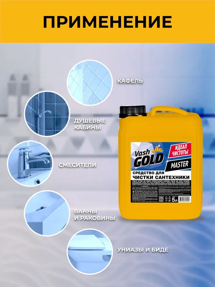 Высокоэффективное средство для чистки оборудования ванных и туалетных комнат, эмалированной сантехники, хромированных кранов, унитазов, биде, раковин, кафельных покрытий и пластиковых панелей. Средство можно использовать в домах с септиками. Средство удаляет следы мыла, известковые налеты, ржавчину, неприятные запахи, придает блеск.