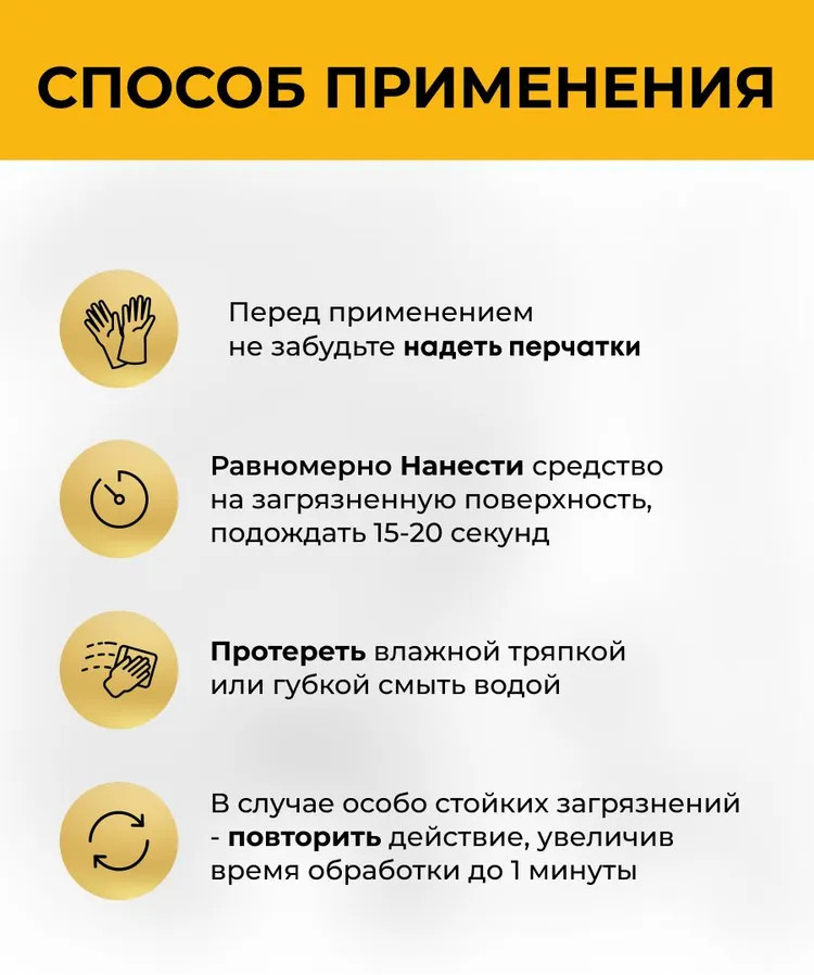 • равномерно нанести средство на очищаемую поверхность, подождать 15-20 секунд. Потереть и смыть водой. В случае особо стойких загрязнений — повторить обработку;