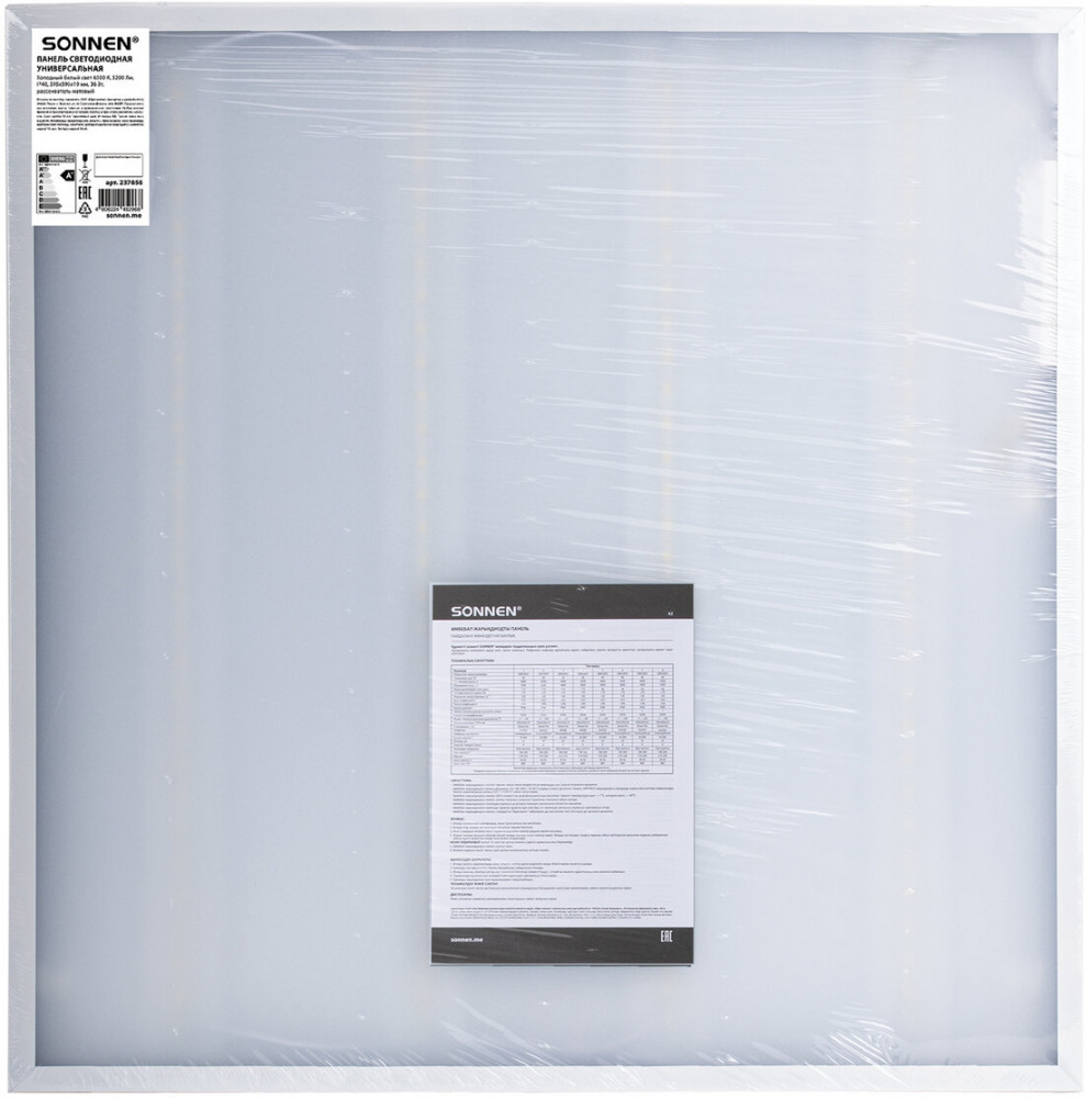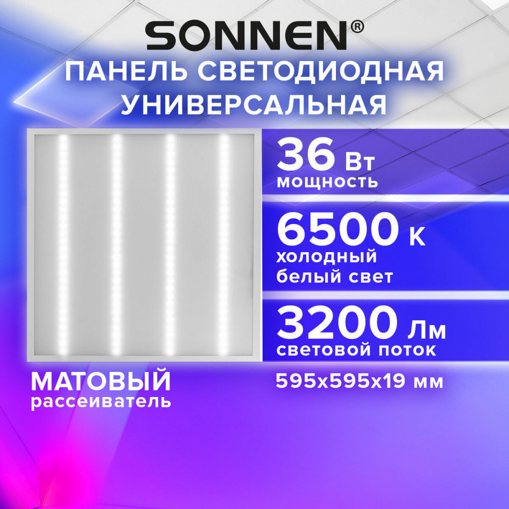 Потолочный светильник Sonnen типа «Армстронг» предназначен для освещения рабочего места в офисе. Драйвер (блок питания для светодиодов) в комплекте! Для установки и работы светильников Sonnen не нужно ничего докупать. Светодиодная панель Sonnen оснащена металлическим корпусом с пластиковыми элементами. Степень пылевлагозащиты IP40 способствует длительному сроку службы. Устройство работает от стандартной электросети с напряжением 180-260 В и мощностью 36 Вт. Высококачественные LED-диоды в количестве 112 штук от ведущего мирового производителя способны работать до 30000 часов. Светильник Sonnen освещает пространство со световым потоком 3200 Лм при цветовой температуре 6500 К, что делает его подходящим для использования в больших помещениях. Размеры устройства — 595×19×595 мм. Индивидуальная упаковка светильника — термоусадочная плёнка. Единица продажи — 1 штука.