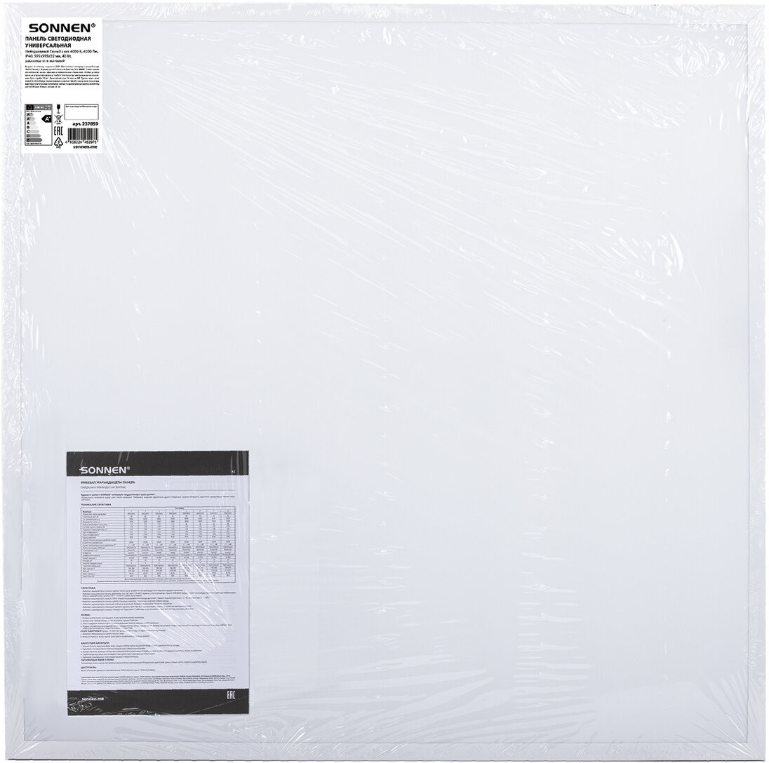 Потолочный светильник Sonnen типа «Армстронг» предназначен для освещения рабочего места в офисе. Драйвер (блок питания для светодиодов) в комплекте! Для установки и работы светильников Sonnen не нужно ничего докупать. Светодиодная панель Sonnen оснащена металлическим корпусом с пластиковыми элементами. Степень пылевлагозащиты IP40 способствует длительному сроку службы. Устройство работает от стандартной электросети с напряжением 180-260 В и мощностью 40 Вт. Высококачественные LED-диоды в количестве 56 штук от ведущего мирового производителя способны работать до 30000 часов. Светильник оснащен матовым рассеивателем с равномерной засветкой. Светильник Sonnen освещает пространство со световым потоком 4200 Лм при цветовой температуре 4000 К, что делает его подходящим для использования в больших помещениях. Размер светодиодной панели — 595×22×595 мм. Индивидуальная упаковка светильника — термоусадочная плёнка. Единица продажи — 1 штука.