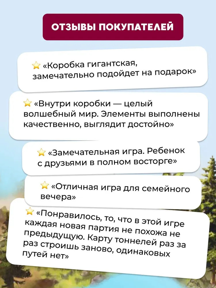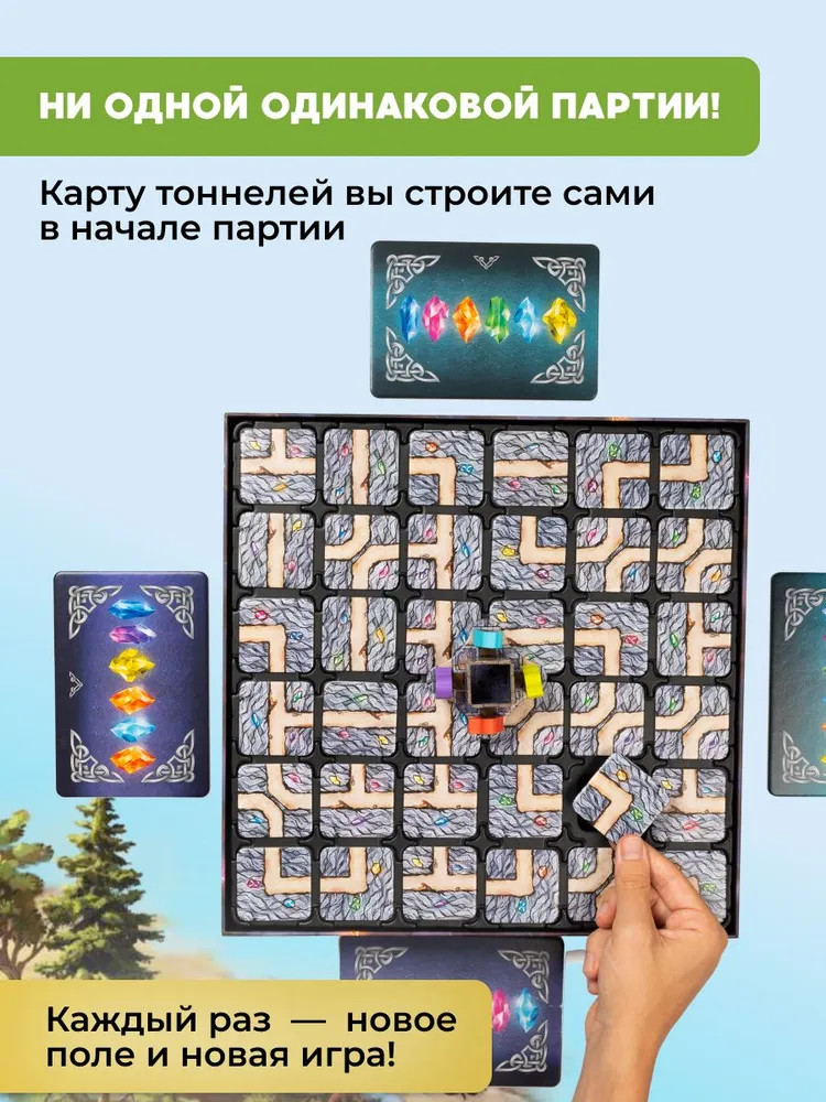 Внутри вы найдёте 4 фишки игроков, 14 карт заданий (7 базового уровня и 7 — усложнённого), замок короля Теовальда, который послужит стартовой площадкой, вместе с подставкой, 3D-поле с ячейками для размещения кристаллов, 36 тайлов туннелей, которые размещаются в произвольном порядке над ячейками и формируют изменяемую часть поля, и 45 реалистичных кристаллов разных цветов: розового, голубого, жёлтого, зелёного, оранжевого, фиолетового, синего и прозрачного. Каждая деталь создана с любовью и вниманием к качеству, что позволяет игрокам полностью погрузиться в атмосферу королевских сокровищ. Кроме того, состав игры включает подробные правила, которые легко понять с первого раза. Все компоненты изготовлены из высококачественных материалов, что гарантирует долгий срок службы. |