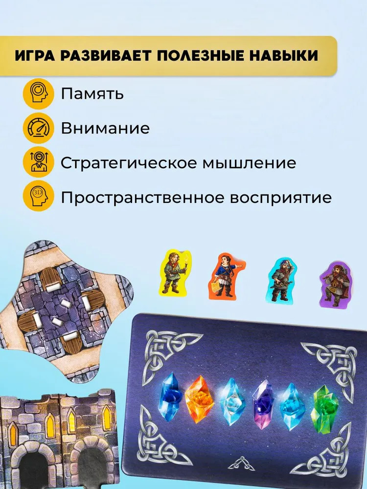 В этой настольной игре есть два режима. В базовом собирать кристаллы можно в любом порядке, он подходит для новичков и начинающих игроков. В продвинутом участникам нужно проявить мастерство и собрать кристаллы в определенной последовательности. Важно помнить, где находятся нужные камни и где уже побывали соперники, так что Kingems отлично развивает память, внимание и стратегическое мышление. Игра рассчитана на 2-4 игрока, подходит для детей от 6 лет. Также в «Самоцветы короля» с азартом играют и взрослые, так что она подходит для всей семьи и компании друзей. Все компоненты изготовлены из высококачественных материалов, что гарантирует долгий срок службы. А вы готовы отправиться в путешествие и стать Великим искателем сокровищ?