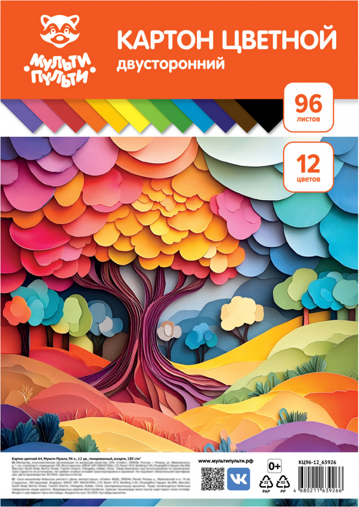 В набор входят 12 сочных оттенков по 5 листов каждого цвета (всего 96 листов в наборе) — идеальная палитра для открыток, скрапбукинка, аппликаций и детского творчества. Премиальное качество картона подойдёт как для детей, так и для требовательных мастеров и педагогов.
