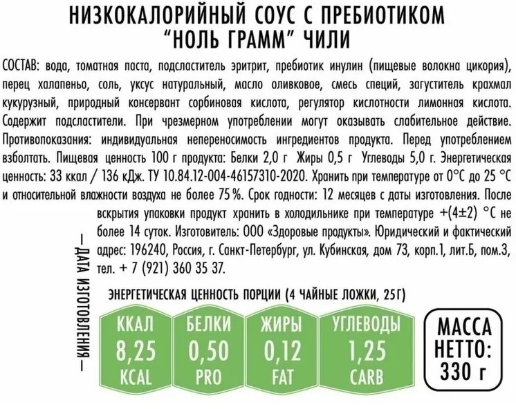Ноль грамм Соус томатный низкокалорийный без сахара «Чили»