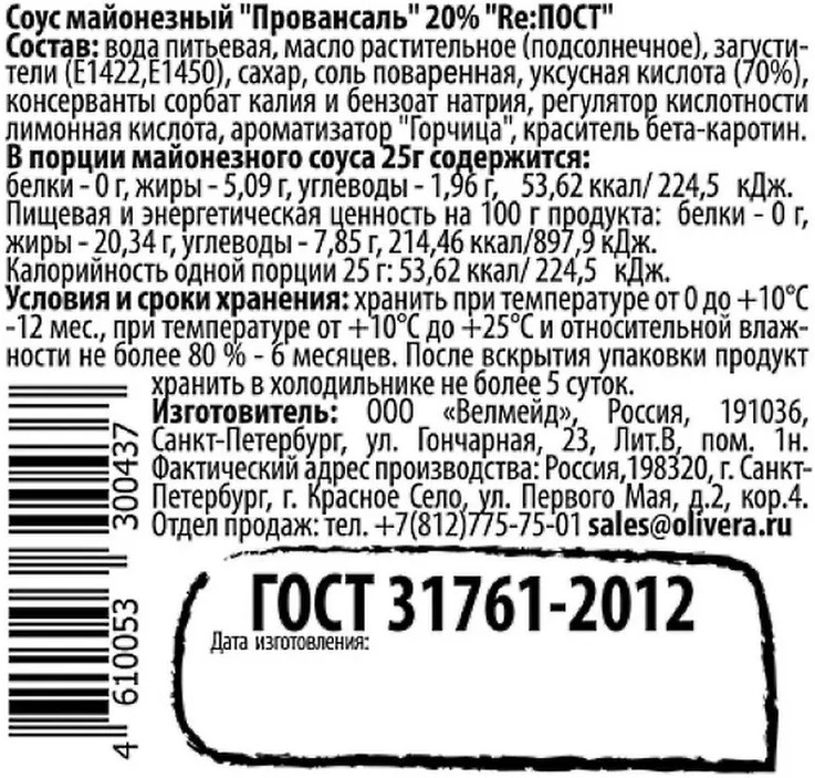 Re:ПОСТ Соус майонезный 20% «Провансаль»