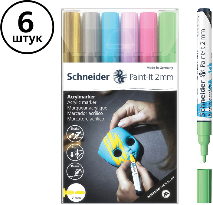 💳 Оплатить за товар можно при получении 🇰🇿 Есть бесплатная доставка по Казахстану 🎁 Копите бонусы с каждой покупки Серия: Paint-It Набор Schneider Paint-It 310 — набор акриловых маркеров для творчества и хобби. Цвет чернил в наборе — золотой, серебряный, пастельный синий, пастельный сиреневый, пастельный розовый, пастельный зеленый. Акриловые чернила на водной основе быстро сохнут, обеспечивают интенсивность цвета, высокие укрывные свойства и стойкость после высыхания. Не содержат ксилол и толуол. Подходит для работ на различных поверхностях: бумага, дерево, камень, гипс и т.д. Перед использованием маркер необходимо встряхнуть для смешивания и равномерной подачи чернил. |