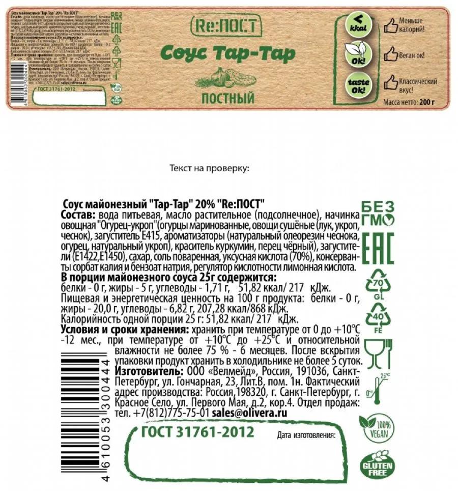 Re:ПОСТ Соус майонезный 20% «Тар-тар»