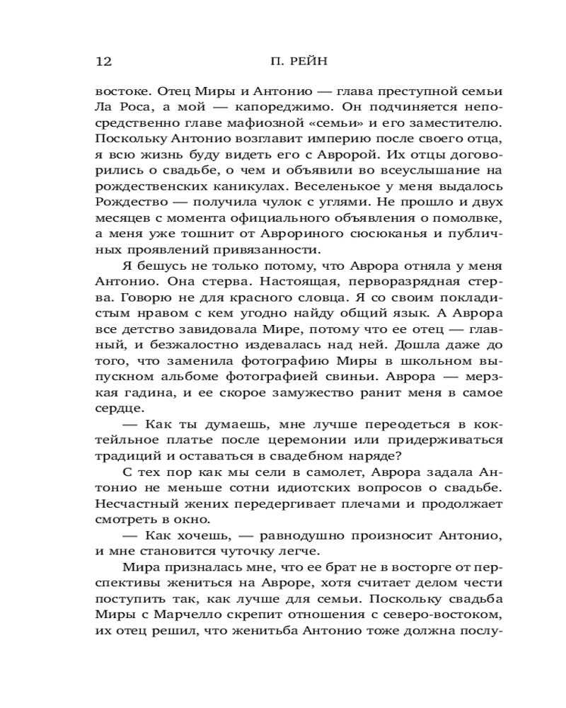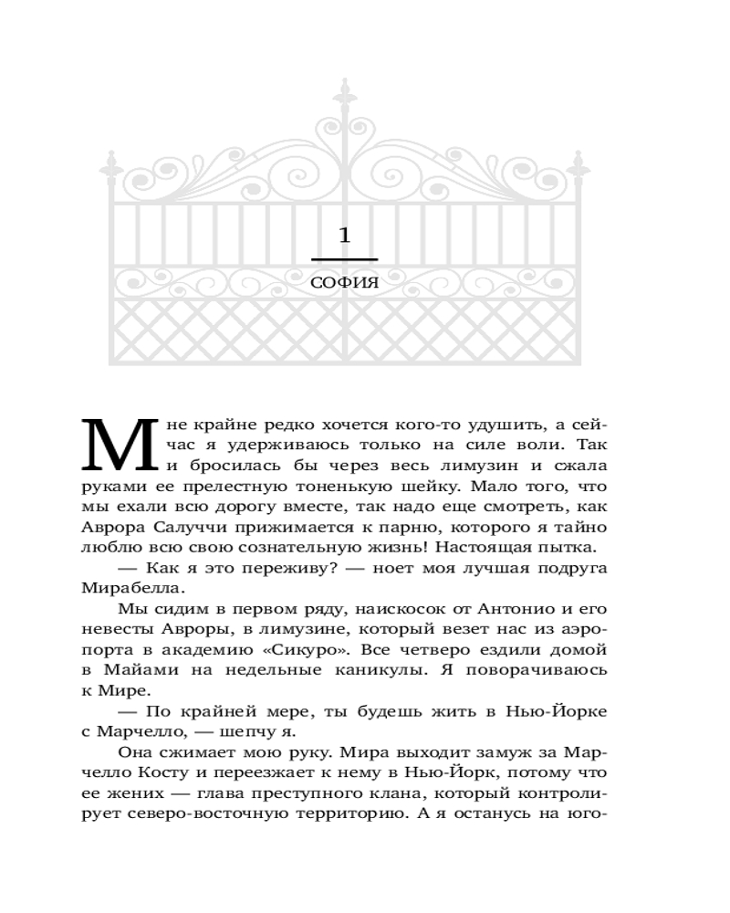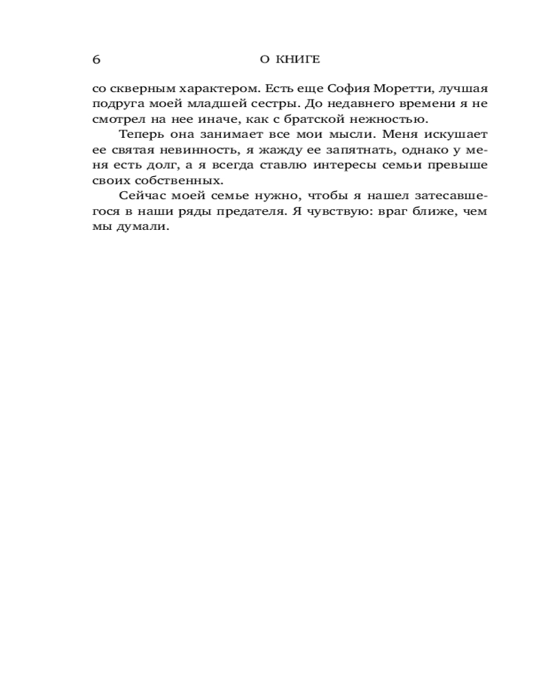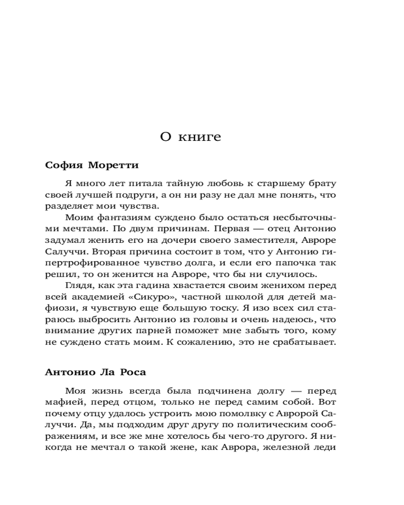 Аврора совсем не та, кого я хотел бы видеть своей женой. То ли дело София, лучшая подруга моей младшей сестры. Раньше я так и воспринимал ее, но теперь порочная невинность Софии манит меня, и эта девушка занимает все мои мысли. Сейчас моей семье нужно, чтобы я нашел затесавшегося в наши ряды предателя. И я чувствую: враг ближе, чем мы думали. Это история клана Ла Роса. Цвет — желтый. |