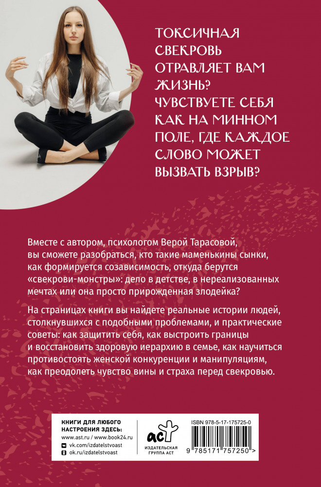 Свекровь отравляет вам жизнь? Чувствуете себя, как на минном поле, где каждое слово может вызвать взрыв? Тогда отложите успокоительное и возьмите в руки эту книгу! Психолог Вера Тарасова возьмет вас за руку и проведет по самым темным уголкам души свекрови, чтобы вы поняли, что вообще происходит! Откуда берутся эти «свекрови-монстры»? Дело в детстве, в нереализованных мечтах, или она просто прирожденная злодейка? Вместе вы разложите все по полочкам: кто такие маменькины сынки, как формируется созависимость и почему свекровь так отчаянно пытается разрушить ваш брак. Но самое главное — на страницах книги вы найдете реальные истории людей, столкнувшихся с подобными проблемами, и практические советы: как защитить себя, как выстроить границы, как разговаривать с мужем и как вернуть себе нормальную жизнь.