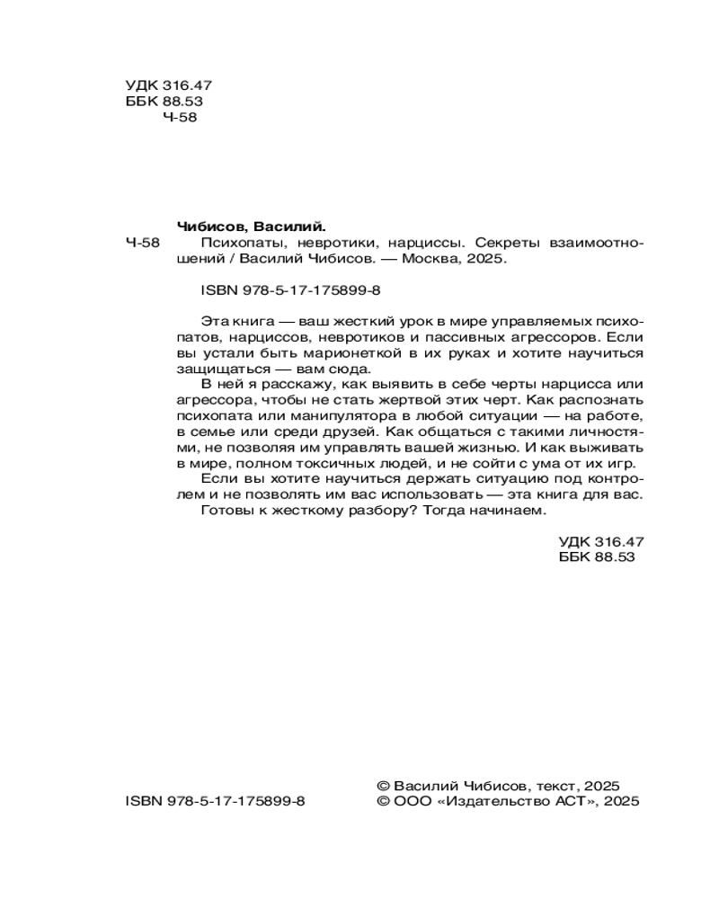 💳 Оплатить за товар можно при получении 🇰🇿 Есть бесплатная доставка по Казахстану от 1 дня 🎁 Копите бонусы с каждой покупки Серия: Звезда соцсети. Подарочное издание Эта книга — ваш жесткий урок в мире управляемых психопатов, нарциссов, невротиков и пассивных агрессоров. Если вы устали быть марионеткой в их руках и хотите научиться защищаться — вам сюда. В ней я расскажу, как выявить в себе черты нарцисса или агрессора, чтобы не стать жертвой этих черт. Как распознать психопата или манипулятора в любой ситуации — на работе, в семье или среди друзей. Как общаться с такими личностями, не позволяя им управлять вашей жизнью. И как выживать в мире, полном токсичных людей, и не сойти с ума от их игр. Если вы хотите научиться держать ситуацию под контролем и не позволять им вас использовать — эта книга для вас. Готовы к жесткому разбору? Тогда начинаем. |