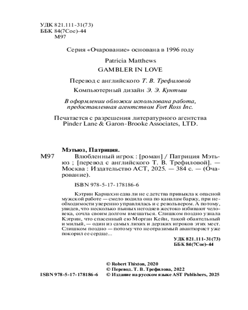 💳 Оплатить за товар можно при получении 🇰🇿 Есть бесплатная доставка по Казахстану от 1 дня 🎁 Копите бонусы с каждой покупки Серия: Очарование (мини)! Кэтрин Карнахэн едва ли не с детства привыкла к опасной мужской работе — смело водила она по каналам баржу, при необходимости уверенно управлялась и с револьвером. А потому, увидев, что несколько пьяных негодяев жестоко избивают человека, сочла своим долгом вмешаться. Слишком поздно узнала Кэтрин, что спасенный ею Морган Кейн, такой обаятельный и милый, — один из самых лихих и дерзких игроков этих мест. Слишком поздно — потому что неотразимый авантюрист уже покорил ее сердце... |