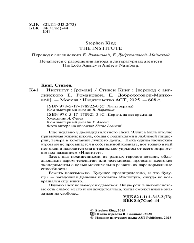 💳 Оплатить за товар можно при получении 🇰🇿 Есть бесплатная доставка по Казахстану 🎁 Копите бонусы с каждой покупки Серия: Хиты экрана Еще недавно у двенадцатилетнего Люка Эллиса была вполне привычная жизнь: школа, обеды с родителями в любимой пиццерии, вечера в компании лучшего друга... Пока одним июньским утром он не просыпается в собственной комнате, вот только в ней нет окон и находится она в тщательно укрытом от всего мира месте под названием «Институт». Здесь над похищенными из разных городов детьми, обладающими даром телепатии или телекинеза, проводят жестокие эксперименты с целью максимально развить их паранормальные способности. |