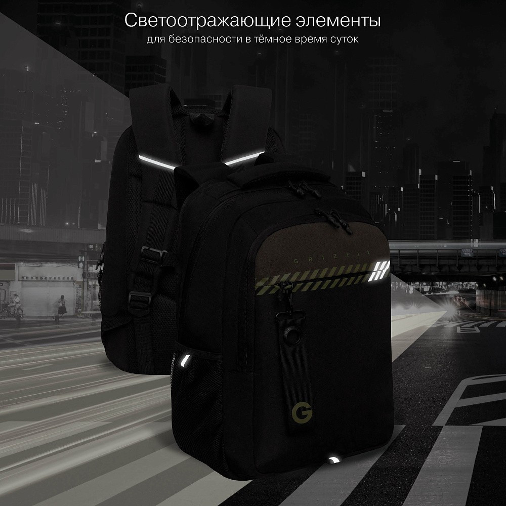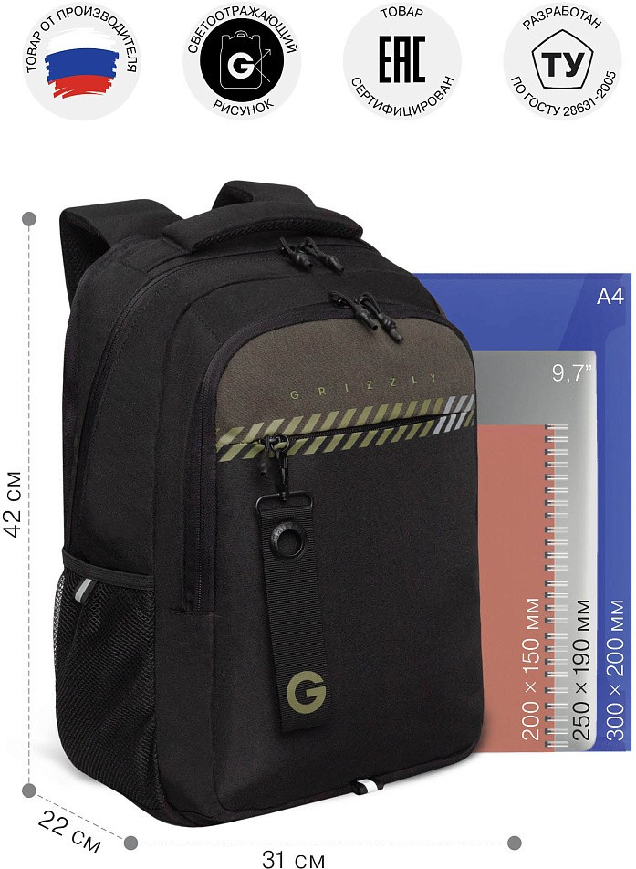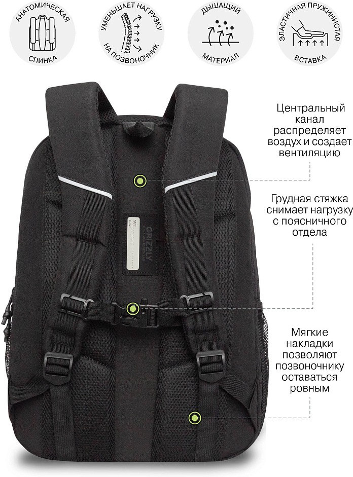 Молодежный рюкзак с анатомической спинкой. Мы создали легкий, прочный и вместительный портфель, который разработан специально для учащихся средней, старшей школы и студентов. Объем рюкзака 20 литров, размер 31×42×22 см. Портфель продуман до мелочей. В основном отделении есть карман для планшета или ноутбука 15″. Дополнительное переднее отделение оснащено съемным держателем для ключей и тремя карманами. В передний карман поместится куча мелочей, боковые карманы из сетки предназначены для бутылки с водой или зонта. Анатомическая спинка, нагрудная стяжка и удобные лямки позволяют равномерно распределять нагрузку на спину и плечи. У рюкзака удобная ручка для переноски, дополнительная ручка-петля и укрепленное дно. Материал портфеля с водо- и грязеотталкивающей пропиткой. Двунаправленные реверсные молнии с брендированными пуллерами на замках позволяют легко его открывать и закрывать. Школьная сумка имеет прочную фирменную подкладку GRIZZLY. Светоотражающие элементы с четырех сторон создают дополнительную безопасность в условиях недостаточной видимости. Рюкзак помогает мальчикам поддерживать порядок в вещах и сохраняет осанку.