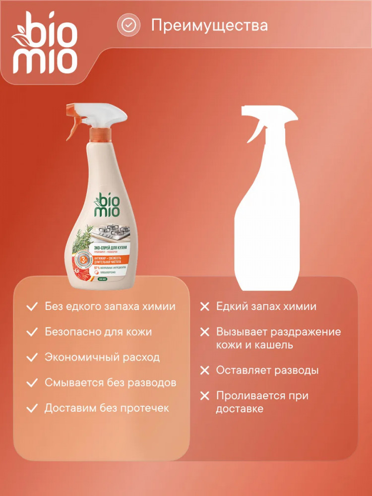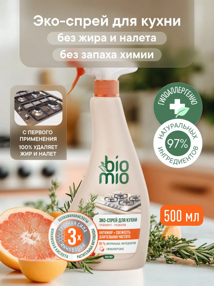 Экологичный спрей для кухни BioMio бережно и эффективно очищает деревянные, каменные, керамические, стеклокерамические, эмалированные, пластиковые, стеклянные и металлические поверхности. Подходит для ежедневной уборки. Содержит 97% ингредиентов натурального происхожден ия. Ароматическая композиция с эфирными маслами грейпфрута и розмарина придает помещению свежесть и создает приятную атмосферу. Очиститель легко справляется с жиром, нагаром и известковым налетом. Идеально подходит для плит, микроволновок, духовок и других кухонных поверхностей. Благодаря удобной форме спрея его можно использовать даже в труднодоступных местах.