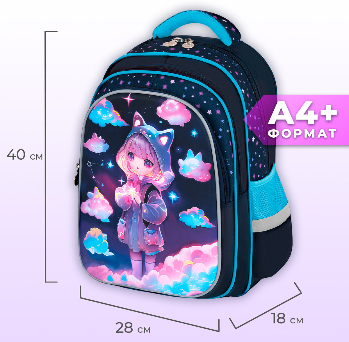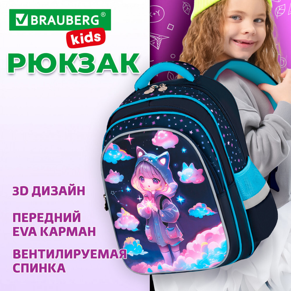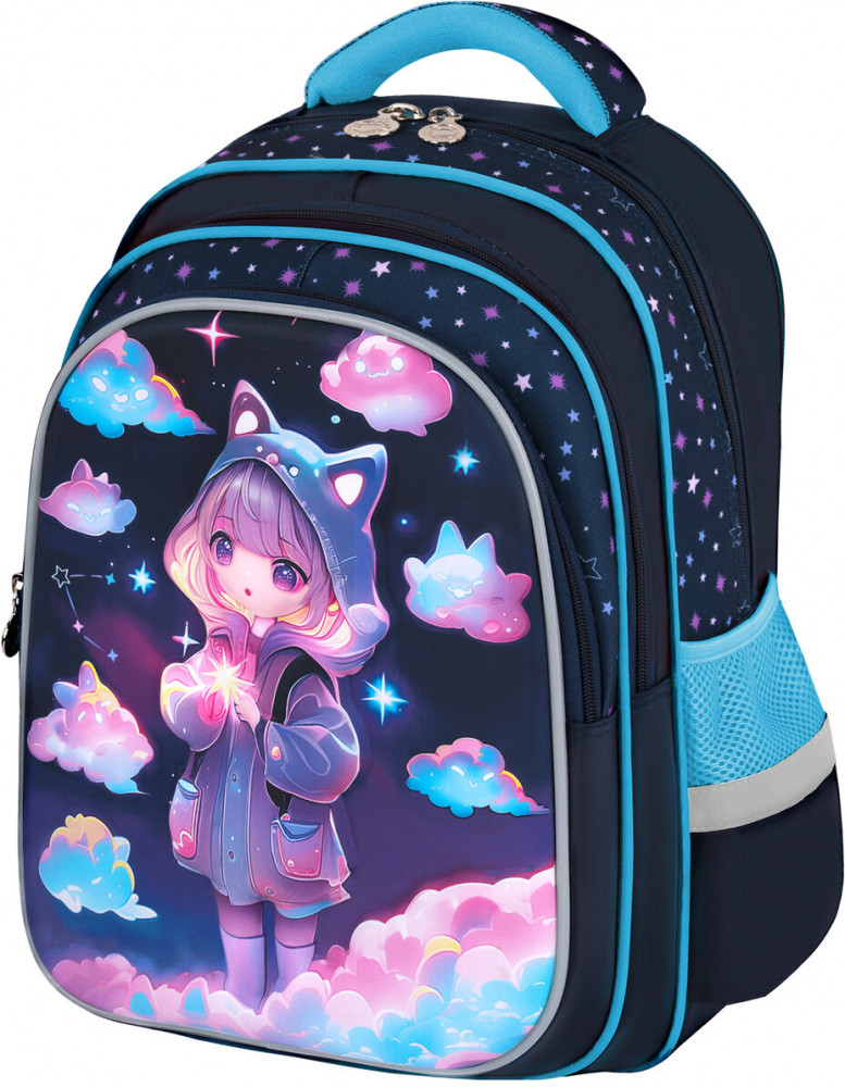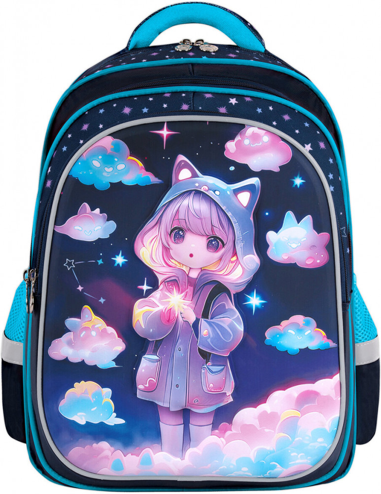 Рюкзак изготовлен из шелковистой влагоотталкивающей ткани, которая легко чистится. Дизайн передней панели рюкзака дополнен уникальным 3D-эффектом – выпуклым рельефным изображением девочки в стиле аниме!