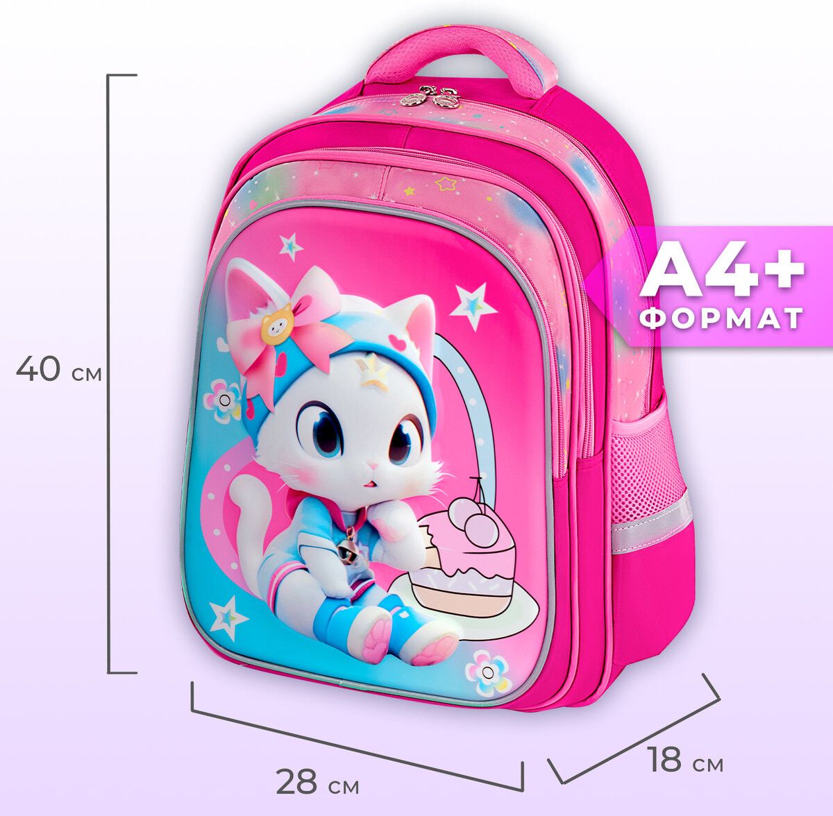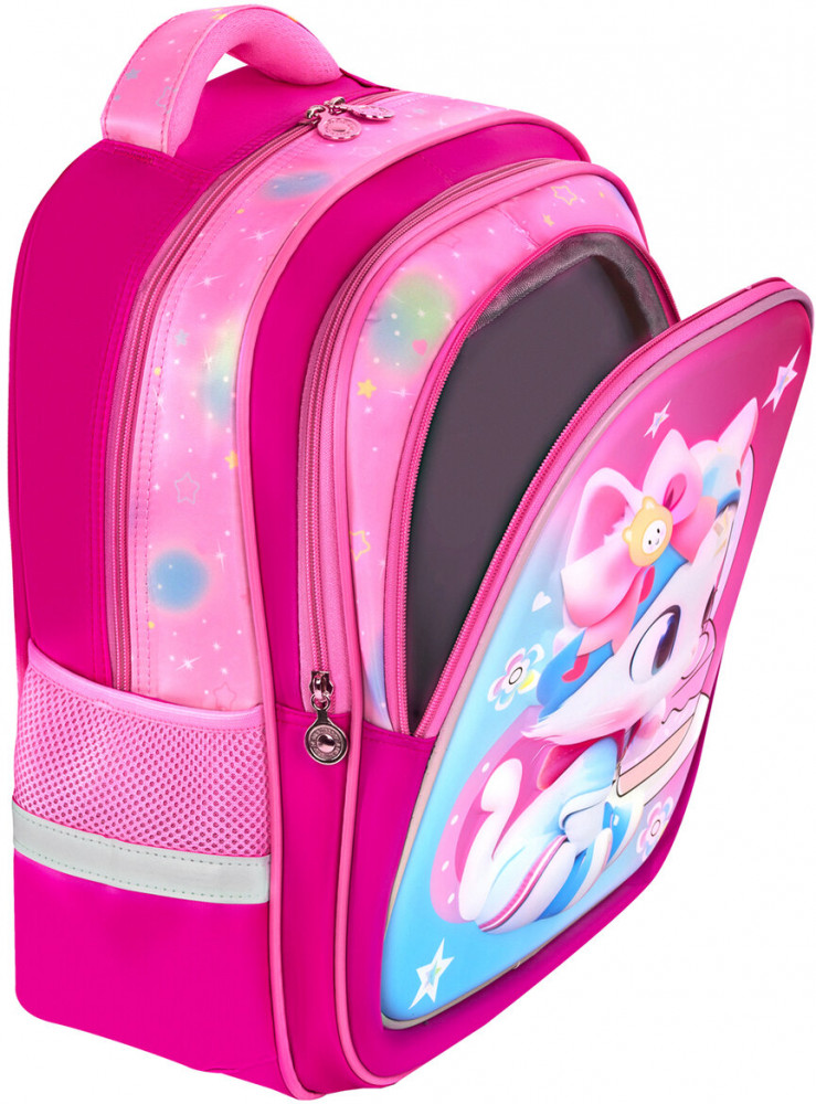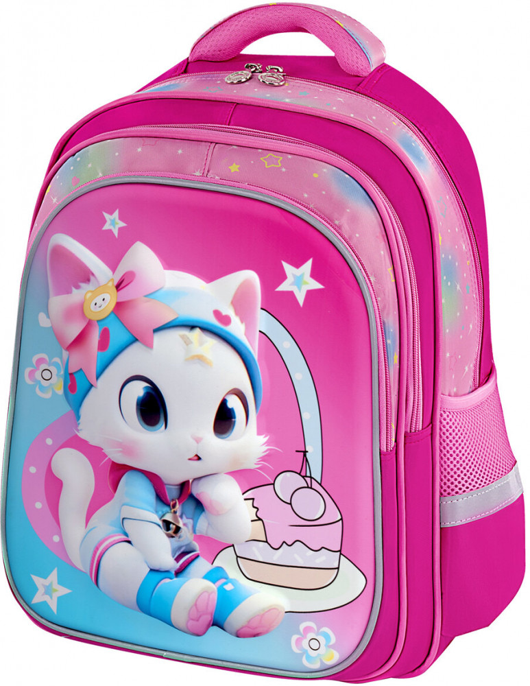 Рюкзак изготовлен из шелковистой влагоотталкивающей ткани, которая легко чистится. Дизайн передней панели рюкзака дополнен уникальным 3D-эффектом – выпуклым рельефным изображением котенка в стиле аниме!