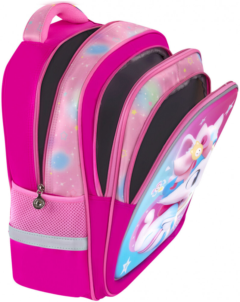 В основном отделении рюкзака можно легко и быстро разместить учебники и тетради формата А4+. Переднее отделение на молнии вмещает тетради и учебники формата А4. Большой передний карман на молнии из легкого формоустойчивого материала EVA предназначен для тетрадей и учебников формата А5, а также прочих канцелярских принадлежностей. Такая организация пространства поможет сохранить принадлежности в порядке и приучить ребенка к аккуратности.