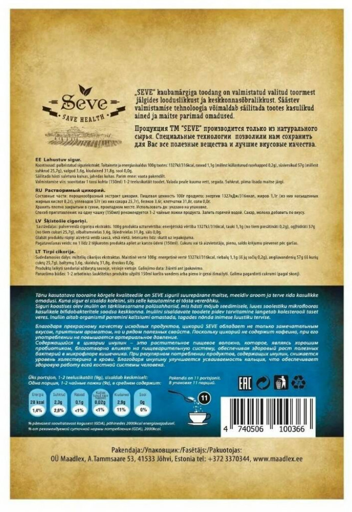 | Продукция ТМ «Seve» производится только из натурального сырья. Специальные технологии сохранили для Вас все полезные вещества и лучшие вкусовые качества. Благодаря прекрасному качеству исходных продуктов, цикорий «Seve» обладает не только замечательным вкусом, приятным ароматом, но и рядом полезных свойств. |