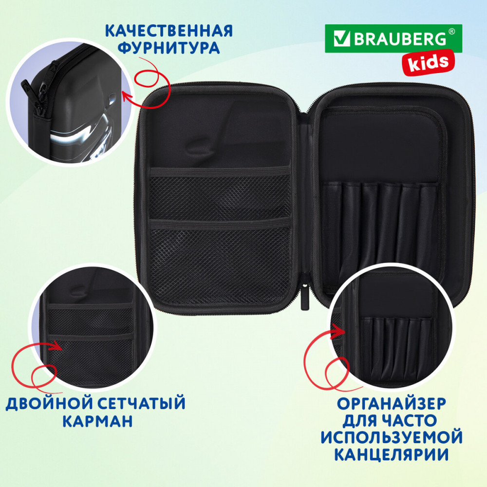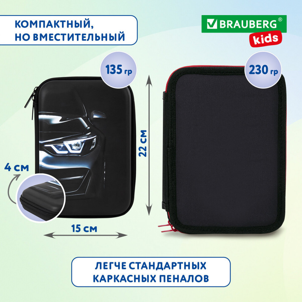 Пенал каркасный Brauberg Kids выполнен из EVA материала — современного и экологичного. Пеналы из такого материала формоустойчивые и легкие. Пеналы Brauberg Kids отличаются яркими уникальными дизайнами с 3D-эффектом. Пеналы Brauberg Kids большого размера 22×15 см удобно брать с собой в школу и на внешкольные занятия, а также использовать дома. Особенность материала EVA делает сам пенал легким и компактным, удобным для переноски в ранце, рюкзаке или сумке.