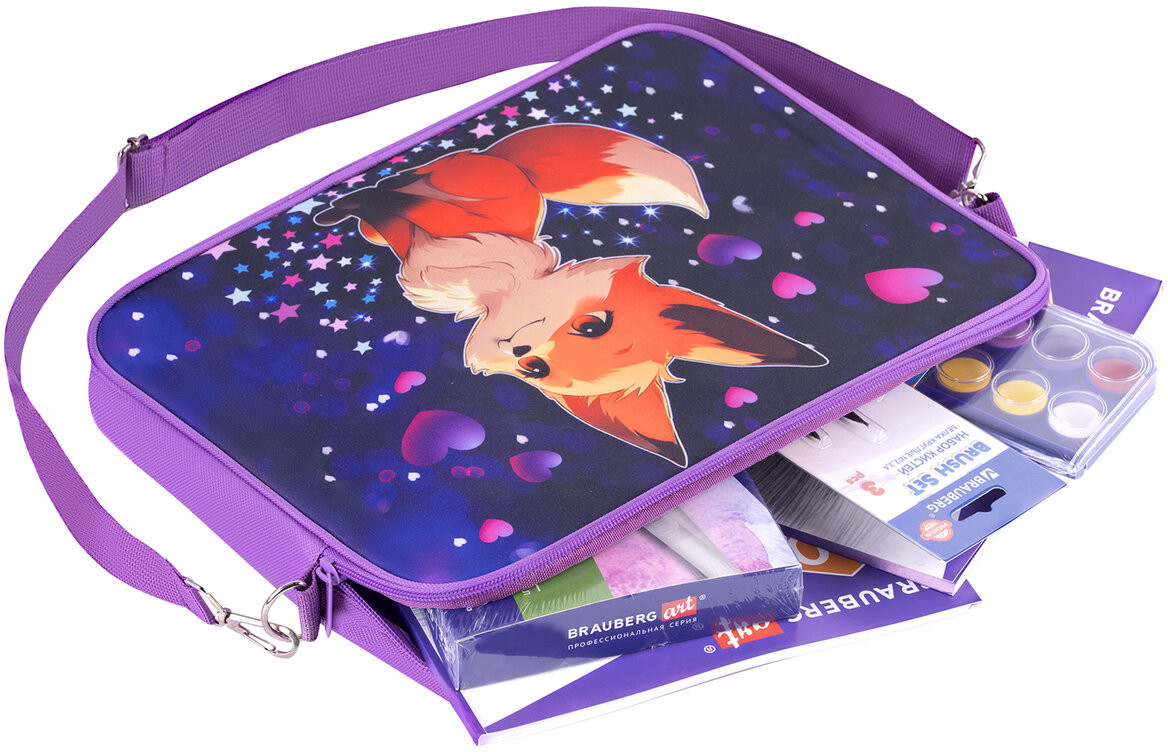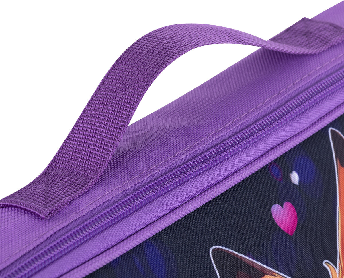 Папка-сумка формата А4 с ручками для переноски изготовлена из прочного полиэстера. Внутри одно отделение, застегивается на молнию по верхнему краю. Размер — 35×26.5×6 см. Широкий формат товара позволяет разместить большое количество канцелярских принадлежностей для творчества внутри, в том числе стакан-непроливайку и листы формата А4.
