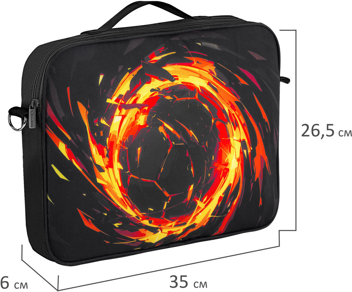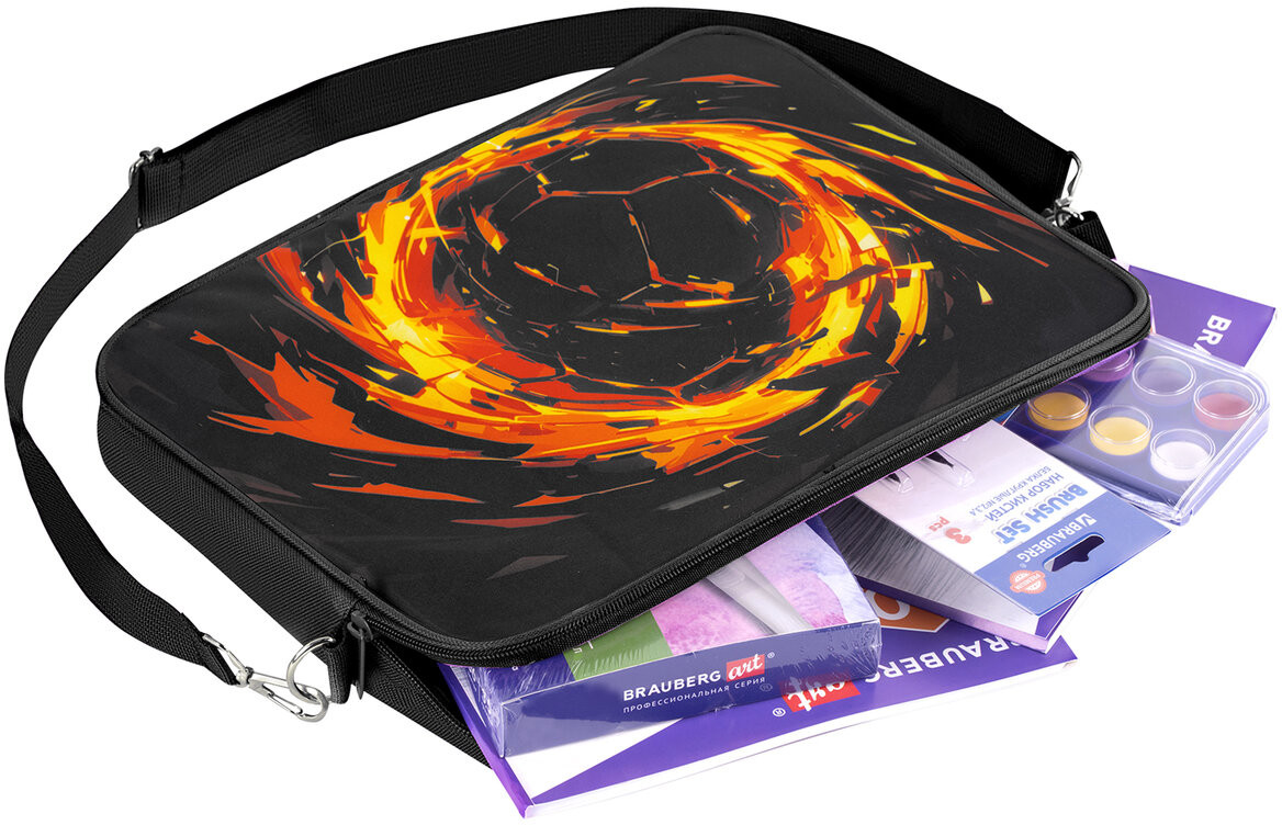Папка-сумка формата А4 с ручками для переноски изготовлена из прочного полиэстера. Внутри одно отделение, застегивается на молнию по верхнему краю. Размер — 35×26.5×6 см. Широкий формат товара позволяет разместить большое количество канцелярских принадлежностей для творчества внутри, в том числе стакан-непроливайку и листы формата А4.