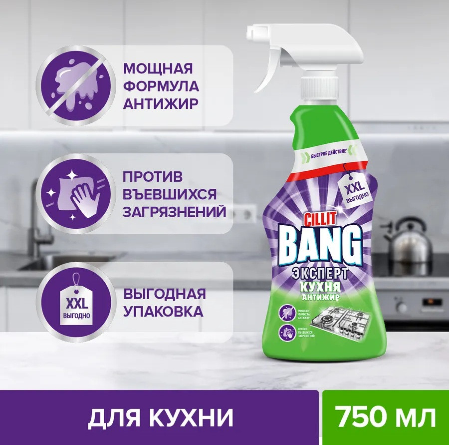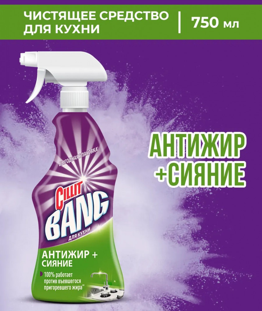 Чистящее средство для кухни Cillit Bang «Антижир и сияние» эффективно удаляет даже въевшийся пригоревший жир, а также масляные пятна и грязь по всему дому. Подходит для ежедневных или застарелых жирных пятен, в том числе пригоревших. Подходит для применения по всему дому: для различных материалов (в том числе мрамор, натуральный камень) и поверхностей, таких как кастрюли, сковороды, шампура, плита, гриль, ручки дверей и шкафов и др. Эргономичный флакон оснащен высоконадежным курковым распылителем, позволяющим легко и экономично наносить раствор на загрязненную поверхность.