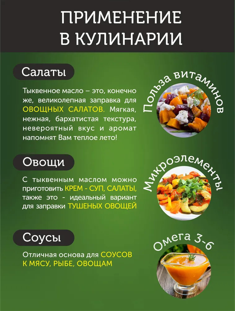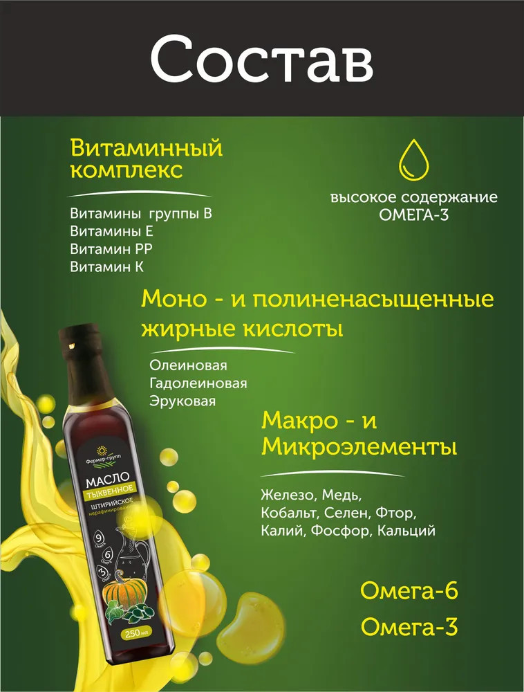 Фермер-групп Тыквенное масло холодного отжима штирийскоеВ данный момент этот товар отсутствует в продаже. Возможно, у нас найдется аналогичный или похожий товар здесь. Тыквенное масло холодного отжима — это натуральный продукт с богатым составом и высокой пищевой ценностью. Оно содержит широкий спектр витаминов, микро- и макроэлементов, а также полезные жирные кислоты. |
