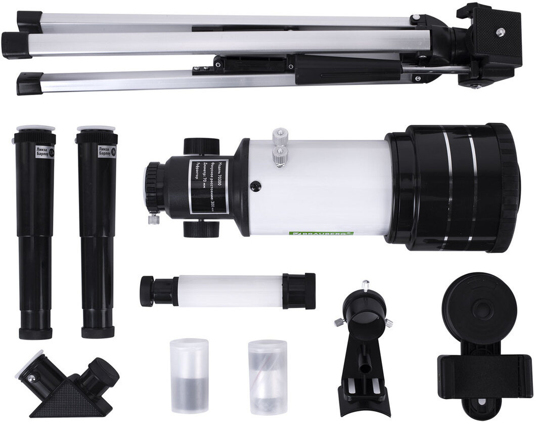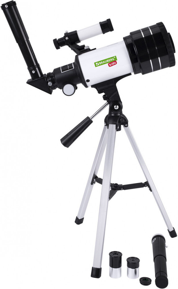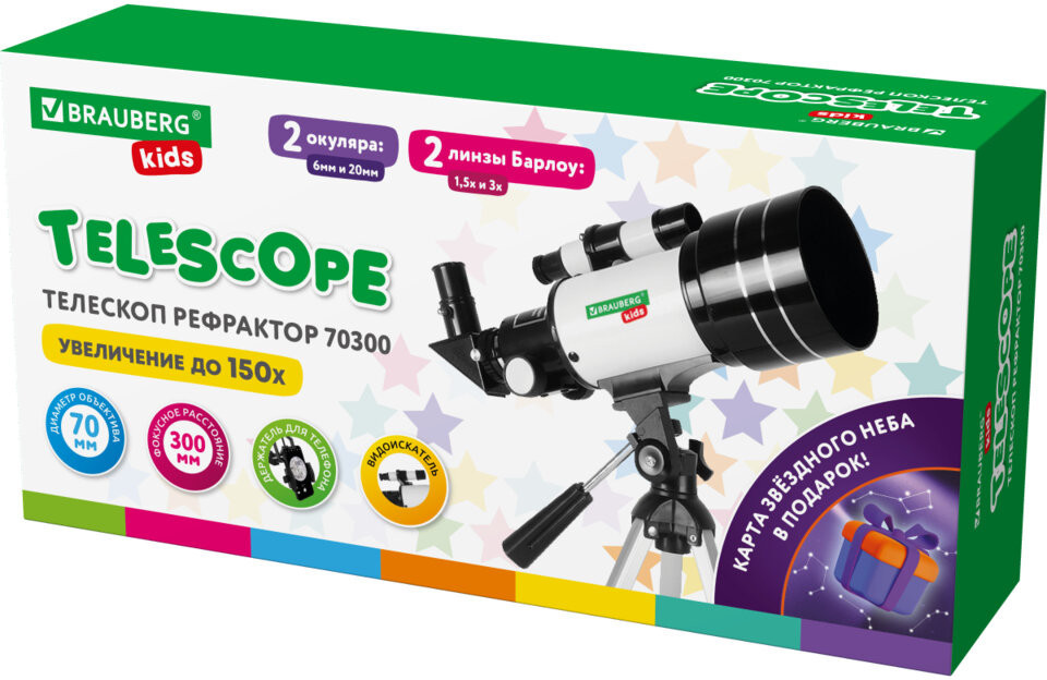 Телескоп рефрактор Brauberg Kids — готовое решение для занятий астрономией на любительском и профессиональном уровне. Фокусное расстояние в 300 мм вкупе с увеличением до 150х позволит наблюдать даже самые отдаленные небесные тела. Диаметр объектива 70 мм обеспечит высокое качество даже тусклых и далёких объектов.