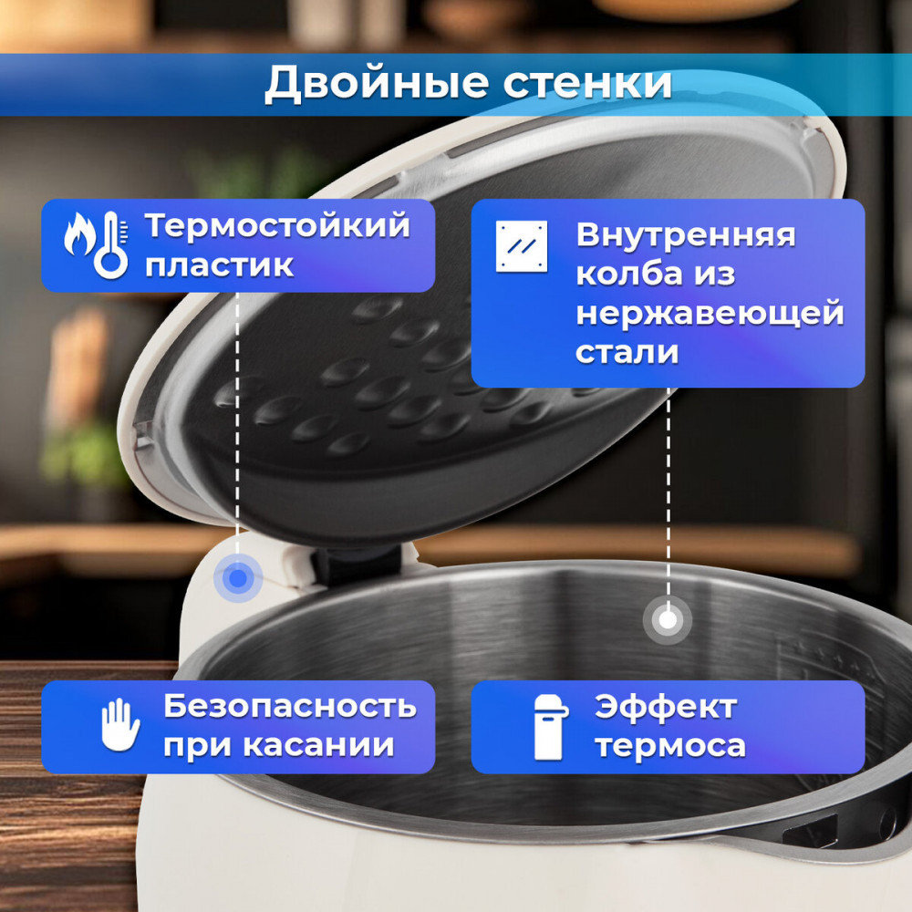 Чайник имеет двойные стенки: внутренняя колба из нержавеющей стали, внешнее покрытие из термостойкого пластика. Такой корпус способствует длительному хранению тепла, а также обеспечивает безопасность при касании. Это особенно важно, если в семье есть маленькие дети.