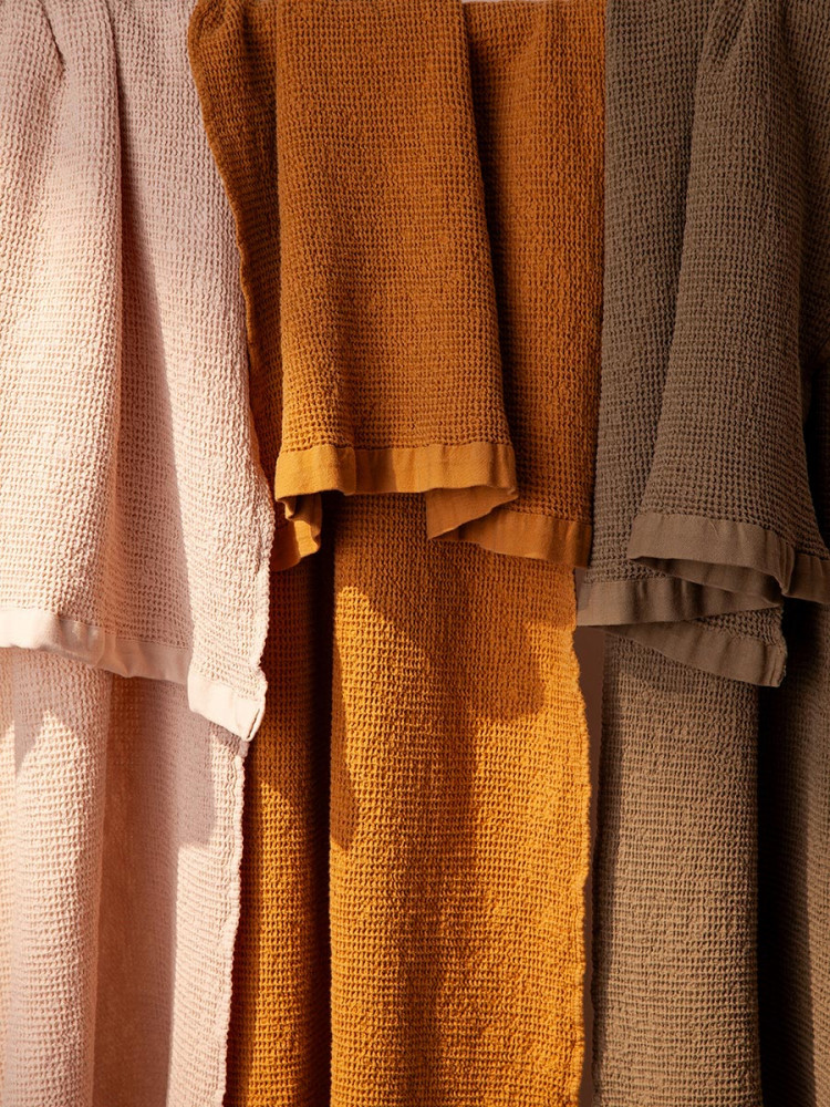 • благодаря вафельному плетению материал хорошо пропускает воздух, быстро сохнет и отличается легкостью;