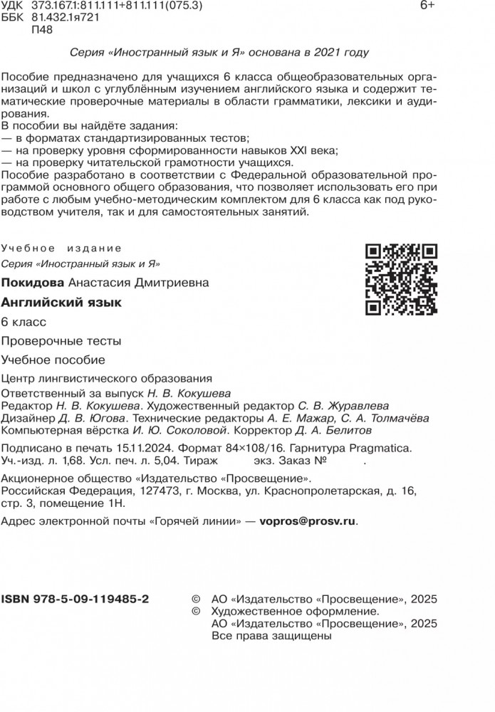 💳 Оплатить за товар можно при получении 🇰🇿 Есть бесплатная доставка по Казахстану от 1 дня 🎁 Копите бонусы с каждой покупки Серия: Иностранный язык и Я Пособие «Проверочные тесты. Английский язык» предназначено для учащихся 6 класса общеобразовательных организаций и школ с углублённым изучением английского языка и содержит тематические проверочные материалы в области грамматики, лексики и аудирования. Содержание пособия разработано в соответствии с Федеральной образовательной программой начального общего образования, что позволяет использовать его при работе с любым учебно-методическим комплектом для 6 класса как под руководством учителя, так и для самостоятельных занятий. Книга идеально подходит для подготовки к ВПР и контрольным работам. |