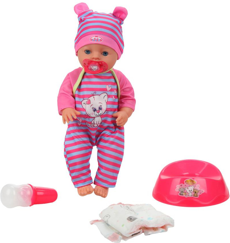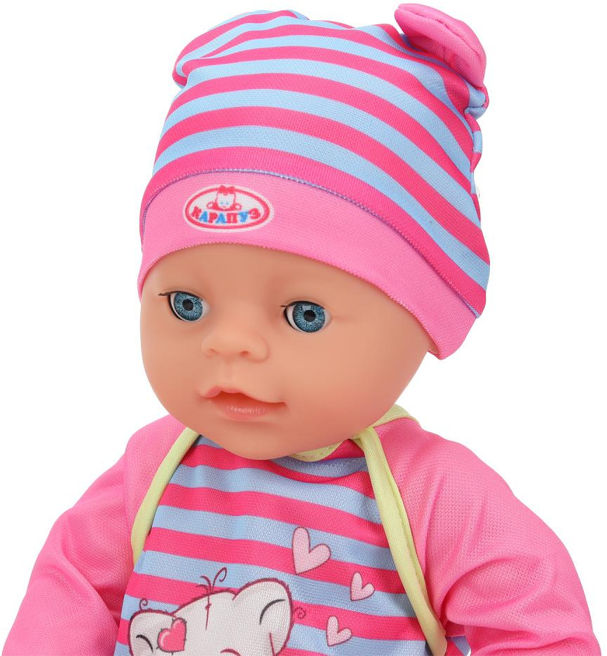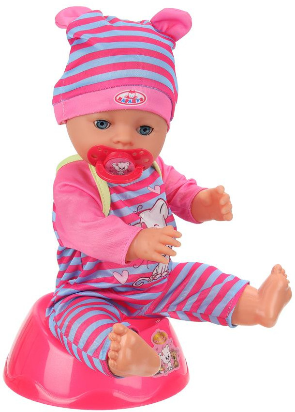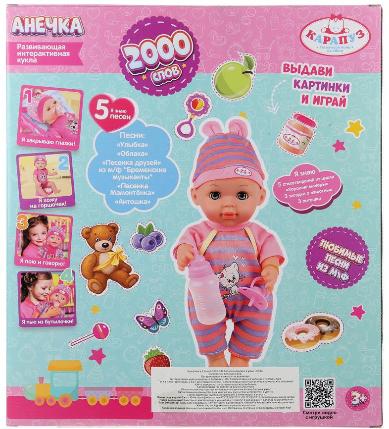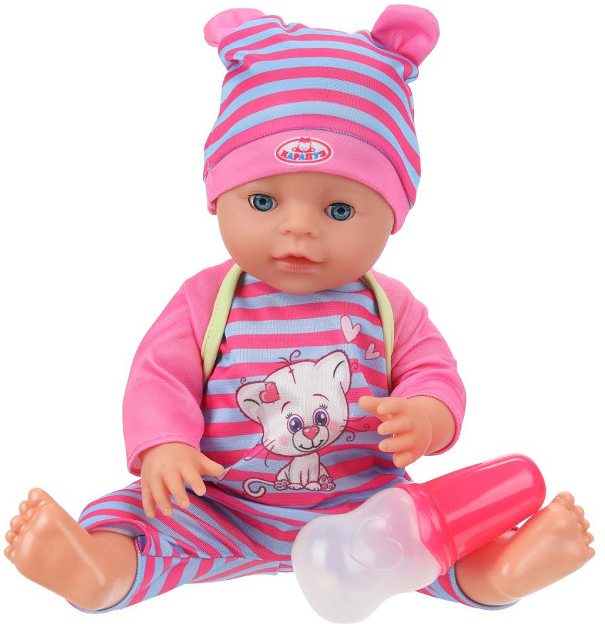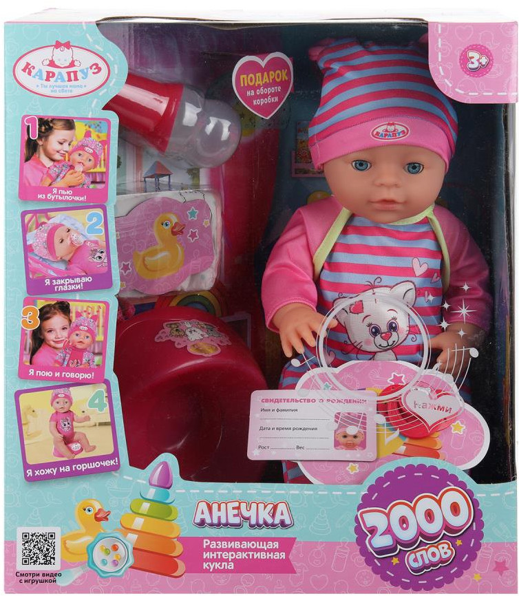 Карапуз Пупс интерактивный «Анечка»В данный момент этот товар отсутствует в продаже. Возможно, у нас найдется аналогичный или похожий товар здесь. Озвученный пупс «Анечка» ТМ «Карапуз» станет прекрасным подарком для девочки. Этот милый пупс обязательно понравится вашей малышке. Кукла одета в разноцветный полосатый комбинезон с длинными рукавами и интересным принтом на груди, на голове — шапочка с забавными ушками в тон. Одежда легко надевается и снимается. Для более интересной игры в комплекте с пупсом идут разнообразные аксессуары. Игра с интерактивным пупсом ТМ «Карапуз» учит ребёнка заботиться об окружающих, быть ответственным и внимательным, а также развивает: воображение, память, звуковое восприятие и музыкальный слух и социально-коммуникативные навыки. |