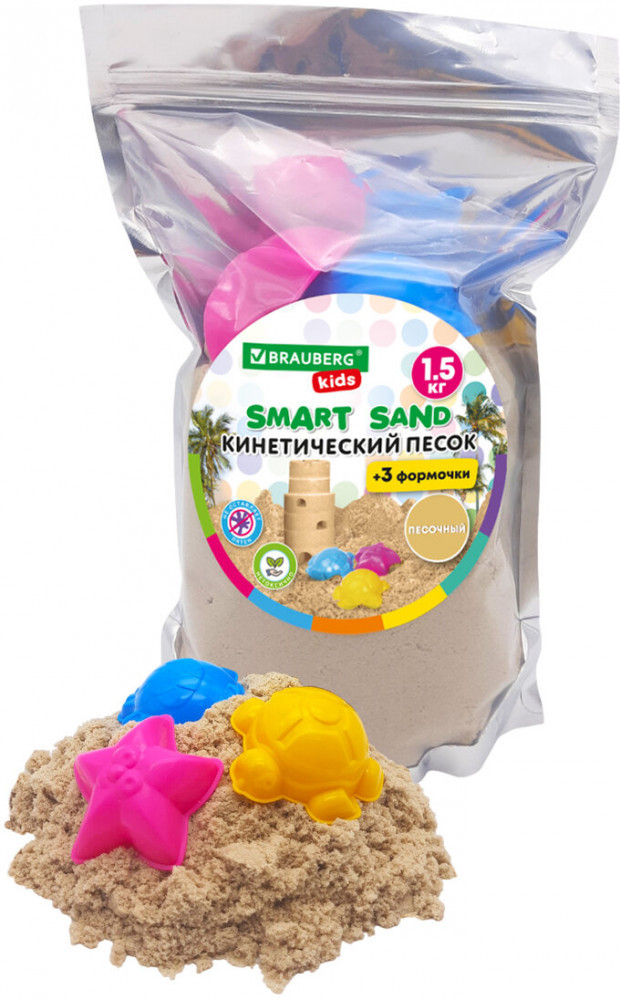 Состав набора: кинетический песок песочного цвета и 3 формочки для лепки. Вес набора — 1500 г. Упакован в пакет дой-пак с замком zip-lock.