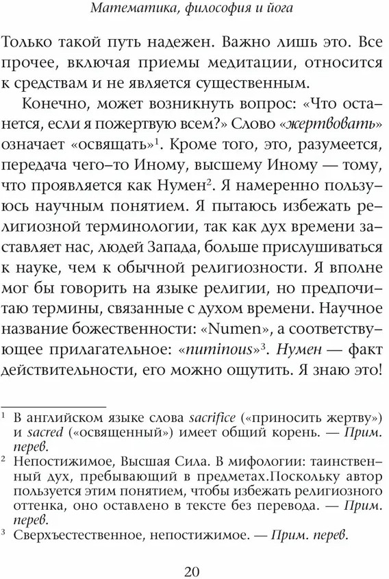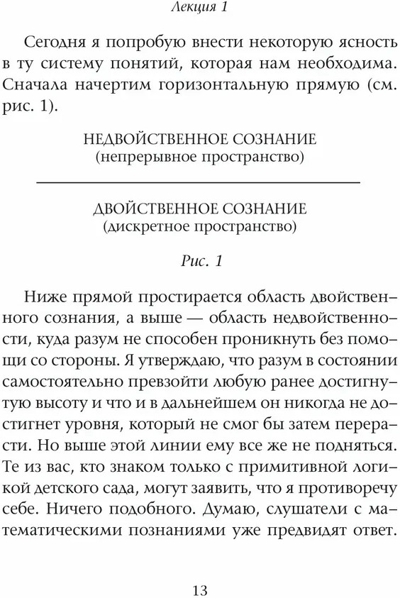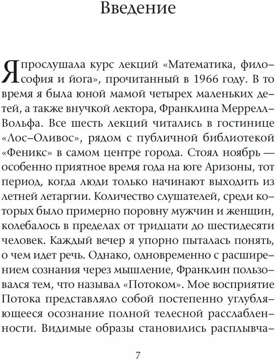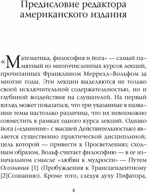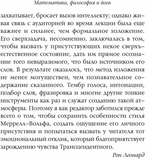 «Математика, философия и йога» — самый памятный из многочисленных курсов лекций, прочитанных Франклином Меррелл-Вольфом за многие годы. Эти лекции выделяются не только своей исключительной содержательностью, но и глубиной воздействия на слушателей. То, о чем говорил Вольф, захватывает, бросает вызов интеллекту. Его сверхзадача, несомненно, заключалась в том, чтобы вызвать у присутствующих некое сверхъестественное состояние, дать им прямое осознание того невыразимого, что было источником его слов. |