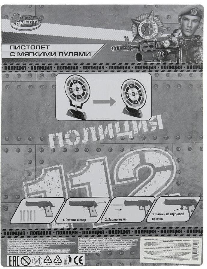 💳 Оплатить за товар можно при получении 🇰🇿 Есть бесплатная доставка по Казахстану от 1 дня 🎁 Копите бонусы с каждой покупки Серия: Полиция Набор оружия «Полиция» ТМ «Играем вместе» станет отличным подарком для юного героя. С таким игровым набором ребёнок сможет придумать и разыграть множество увлекательных сюжетов. При этом он также потренирует свою меткость, стреляя из оружия безопасными мягкими пулями, для этого в комплекте предусмотрена специальная мишень. Набор подойдёт для активных игр на воздухе и в помещении. Игра с набором ТМ «Играем вместе» развивает: воображение, внимание, моторику и координацию движений. |